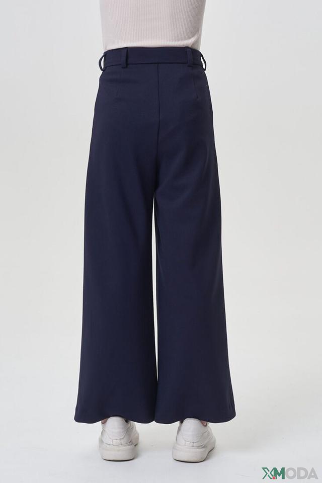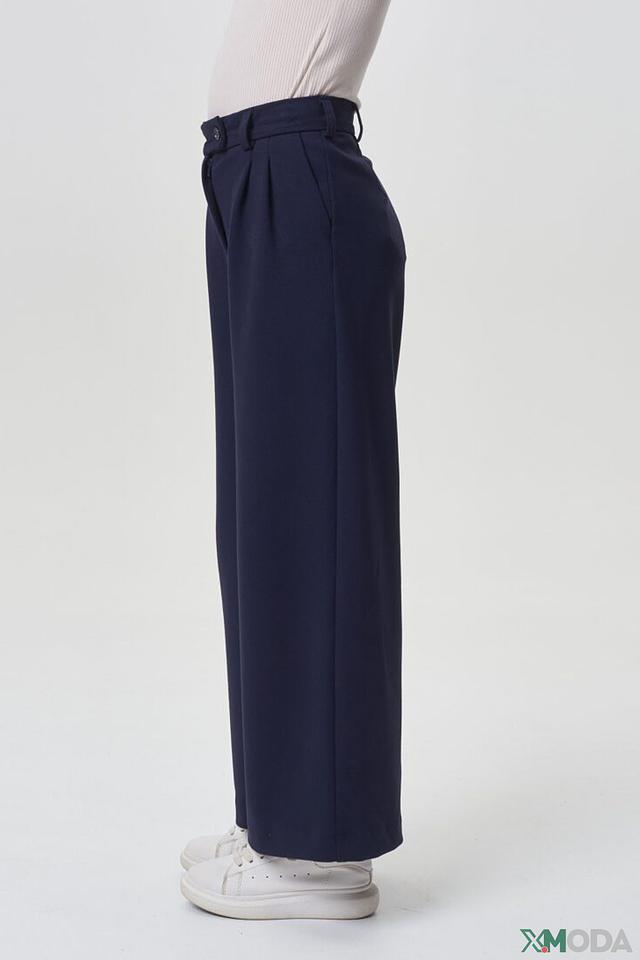 Брюки имеют прямой крой и широкие штанины, обеспечивающие свободу движений и удобство в носке. Высокая посадка подчеркивает талию и создает аккуратный силуэт. На брюках предусмотрены боковые карманы, а также пояс с застежкой на пуговицу и молнию.