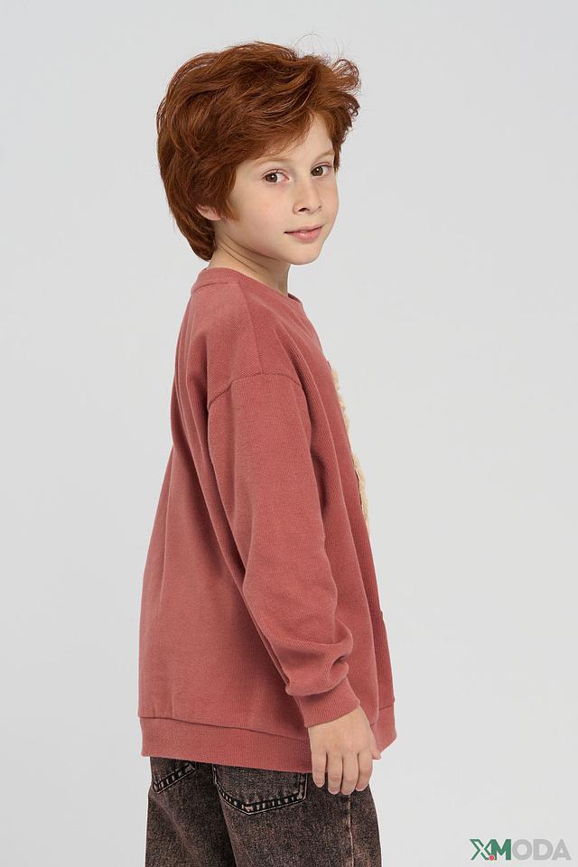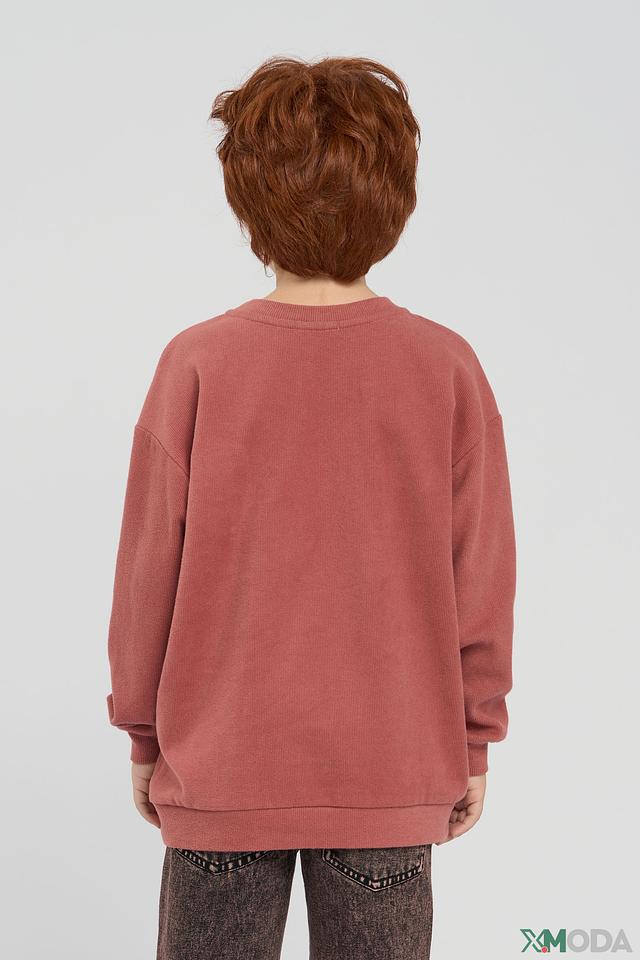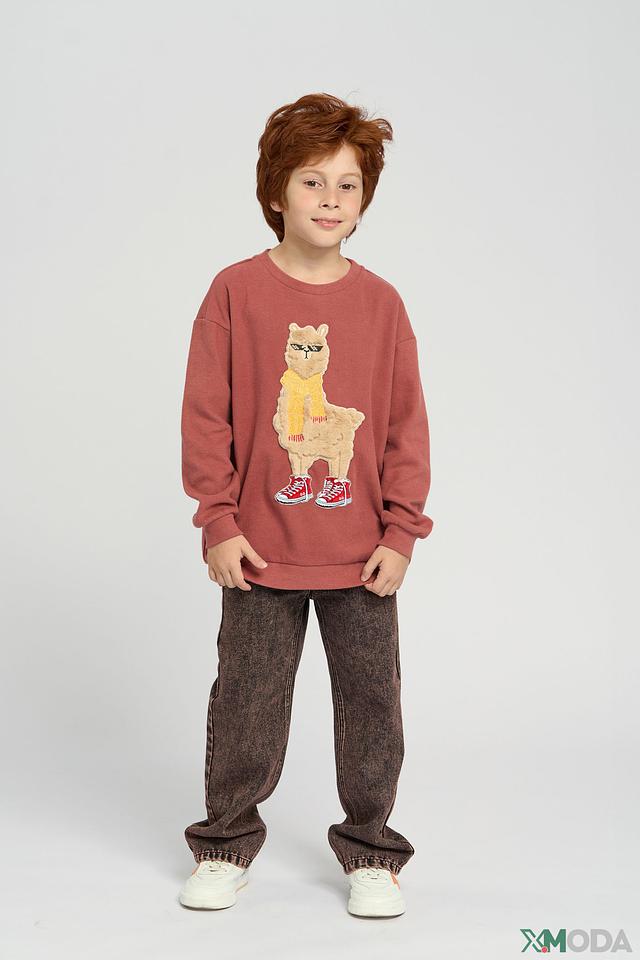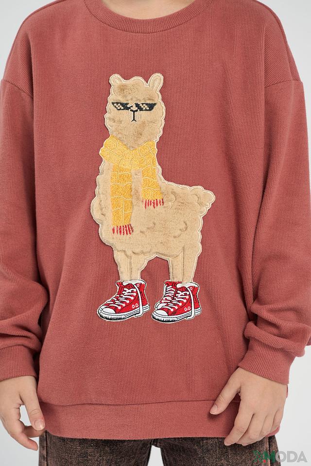 Основной цвет джемпера – розовый. На передней части изделия расположен яркий принт в виде ламы в модных очках и красных кроссовках. Этот забавный элемент делает джемпер оригинальным и привлекательным для детей. Модель имеет классический крой с длинными рукавами и круглым вырезом горловины.
