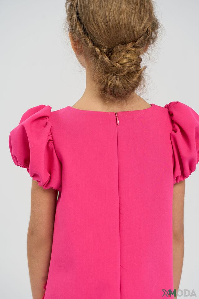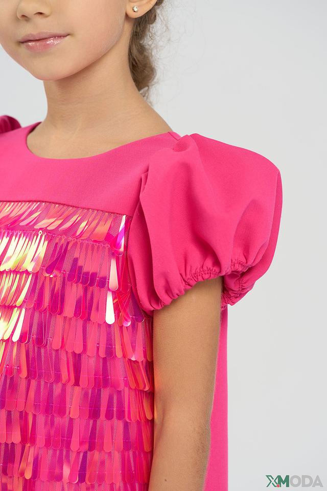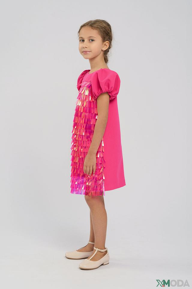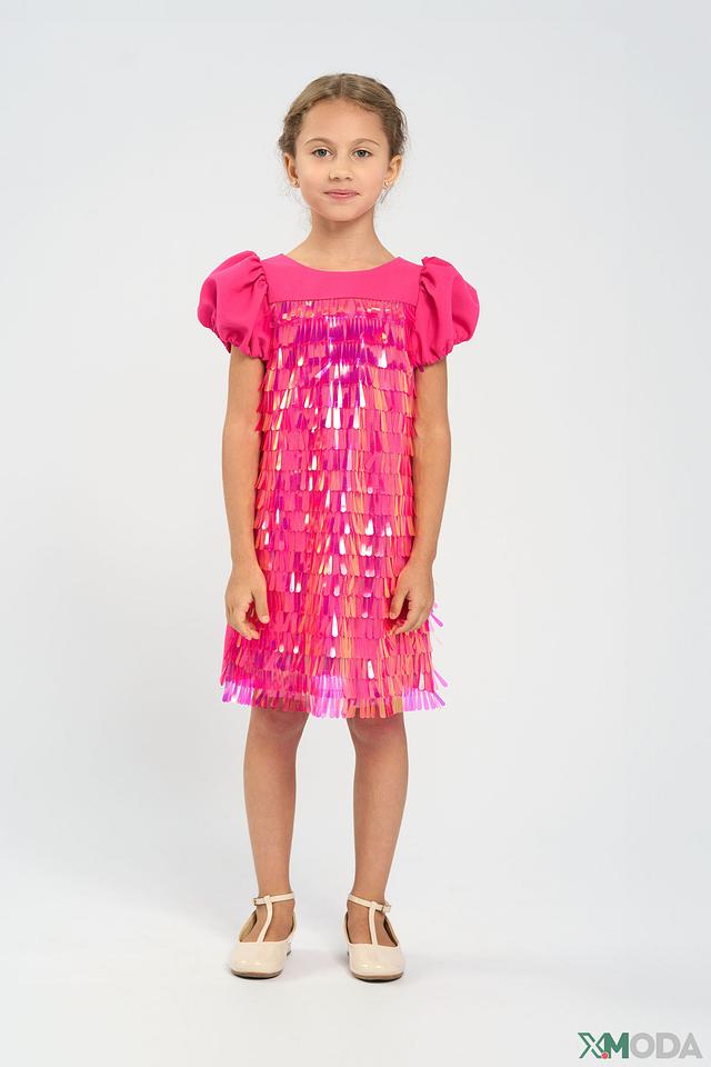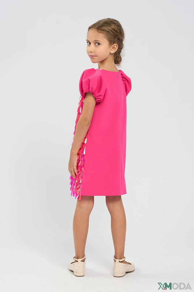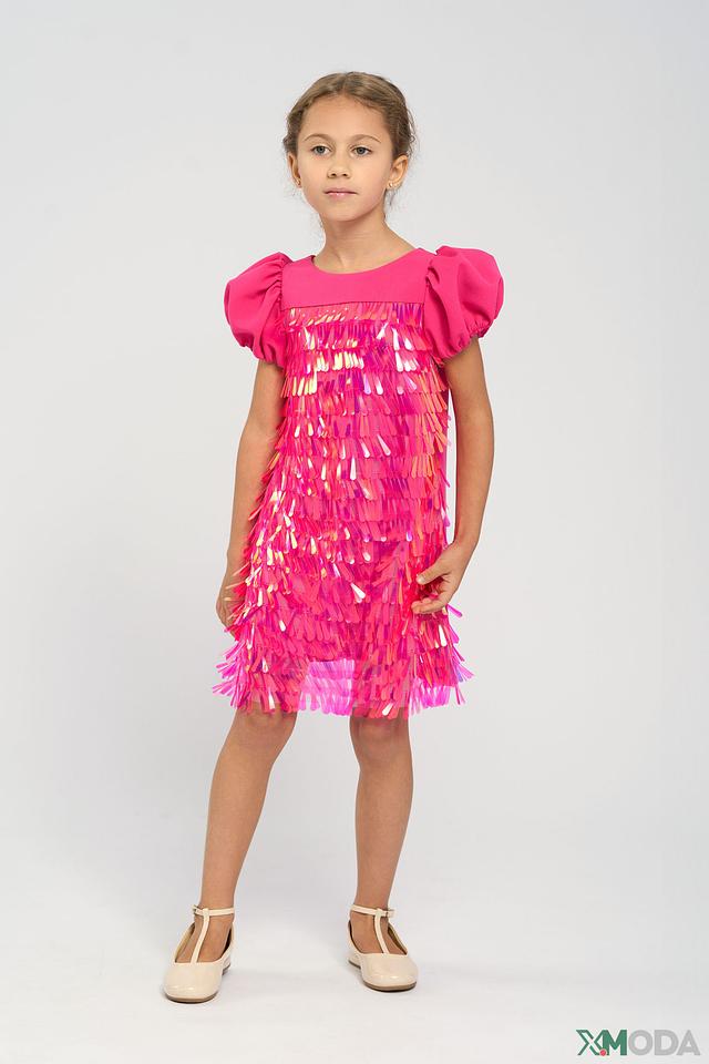 Платье имеет прямой силуэт и короткие рукава-фонарики, которые придают образу лёгкость и воздушность. Бахрома, выполненная в розовых и серебристых оттенках, создает игривый и праздничный эффект.