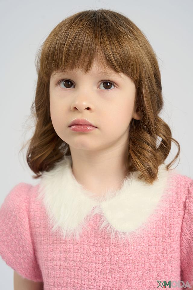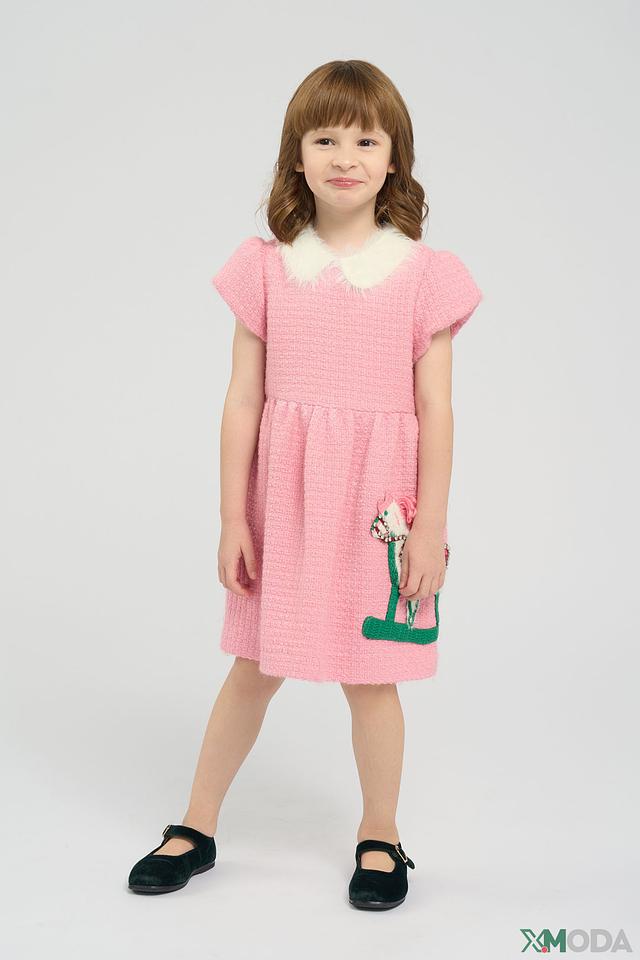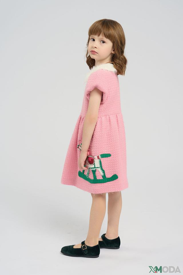Модель имеет короткие рукава и аккуратный воротничок, отделанный белым мехом, что делает образ более нарядным и милым. Передняя часть платья украшена яркой аппликацией в виде лошадки, которая обязательно понравится маленькой принцессе.
