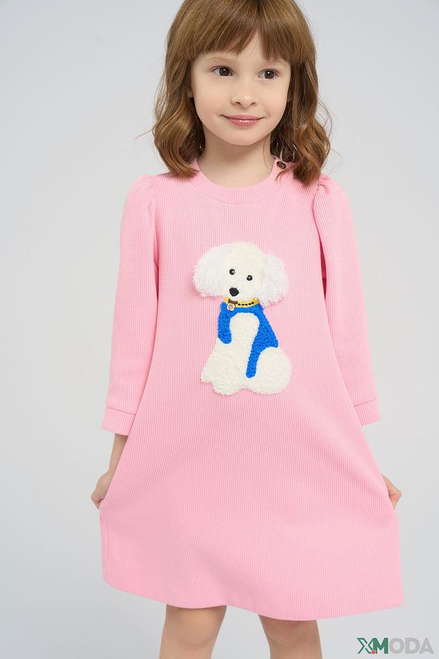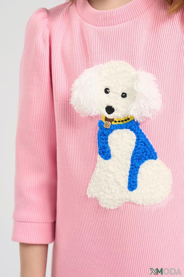 Основным украшением платья является аппликация в виде милого щенка, выполненная в белых и голубых тонах. Аппликация добавляет образу игривости и очарования. Платье имеет длинные рукава и круглый вырез горловины.