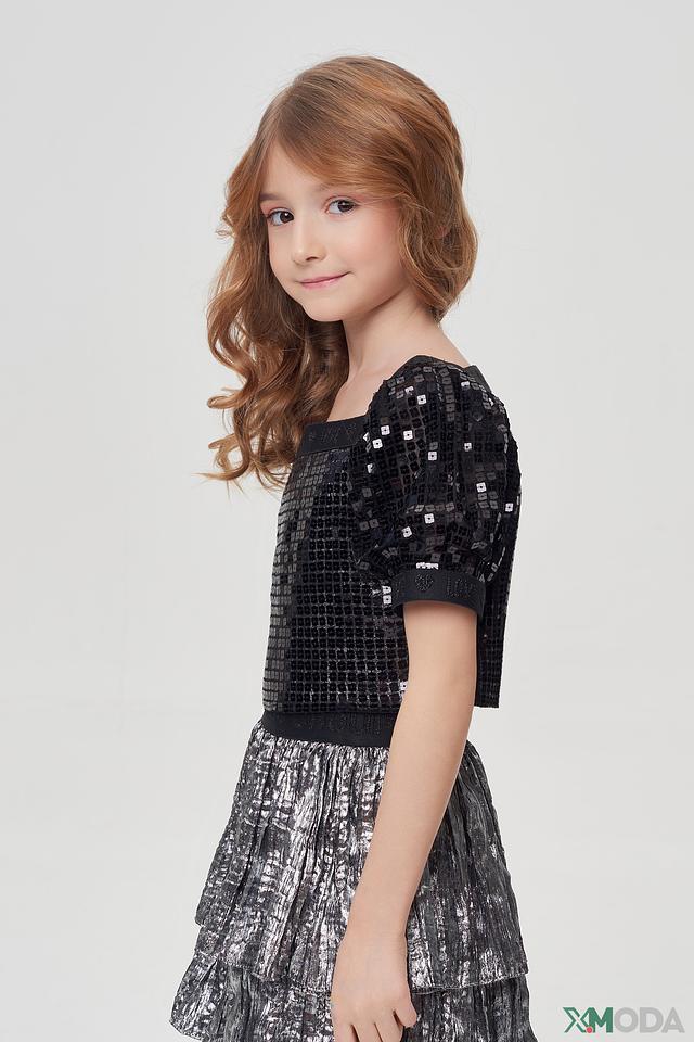 Эта очаровательная блуза от Choupette станет ярким акцентом в гардеробе юной модницы. Блуза выполнена в чёрном цвете и полностью покрыта сверкающими пайетками, что придает ей праздничный и нарядный вид.