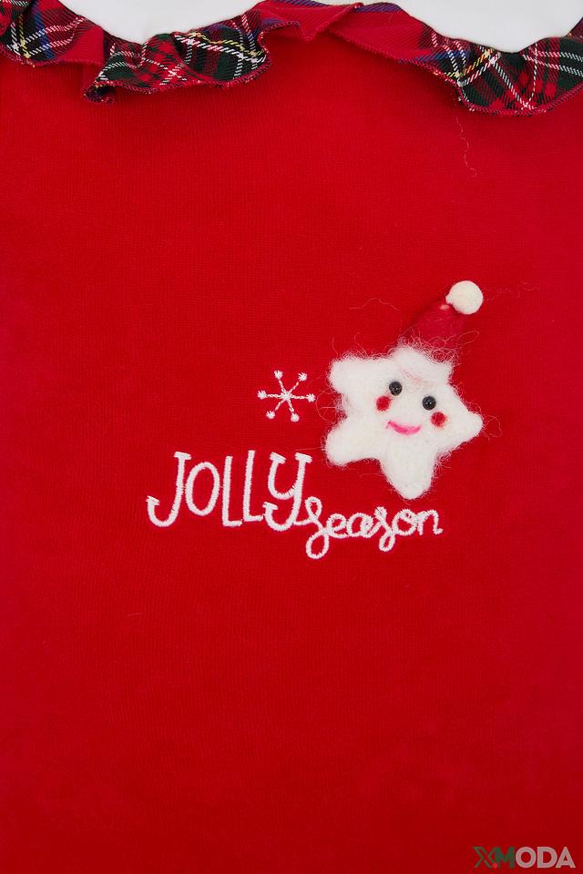 Комбинезон имеет насыщенный красный цвет и украшен милым новогодним принтом в виде снеговика и надписью "JOLLY Season". Воротник отделан клетчатой тканью, что придает образу особый шарм.