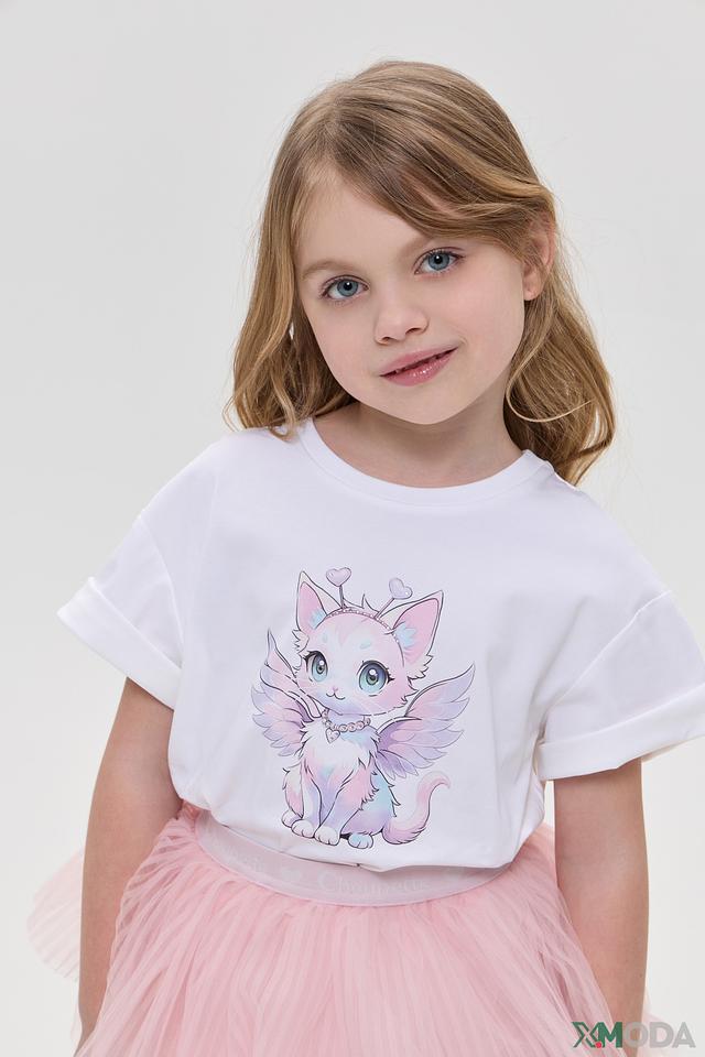 Эта очаровательная футболка от Choupette станет отличным дополнением к гардеробу юной модницы. Футболка выполнена в белом цвете и украшена милым принтом с изображением котика с крыльями и рожками.