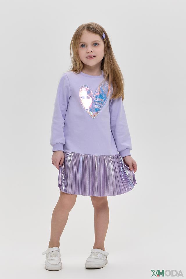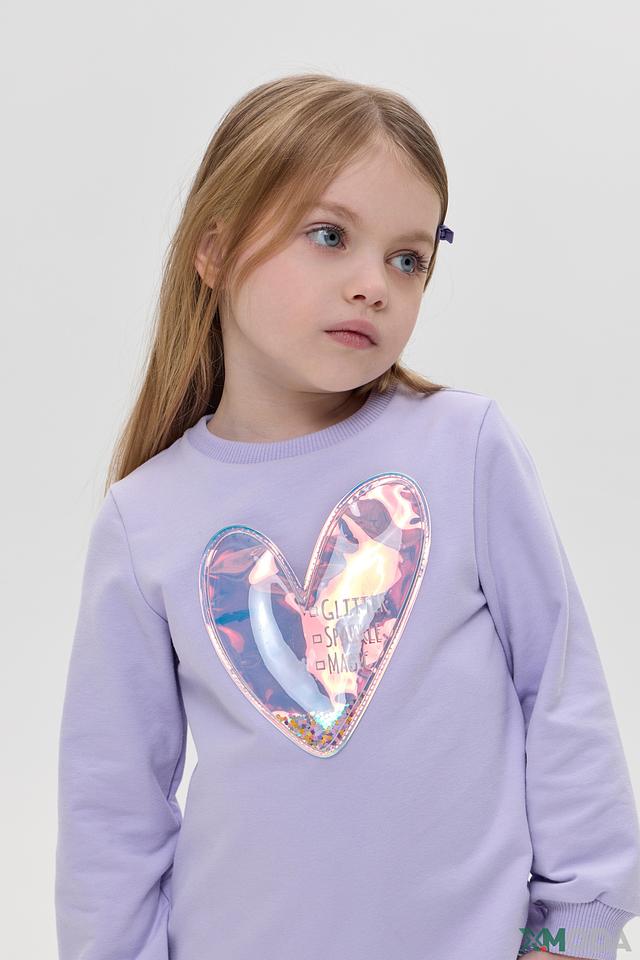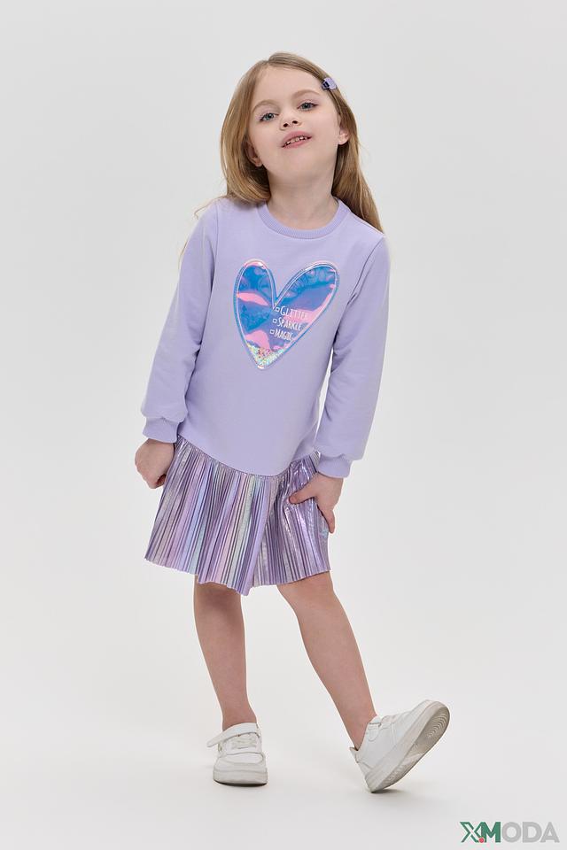 Верх платья – это уютный лонгслив, украшенный аппликацией в форме сердца с блестками. Плиссированная юбка добавляет образу игривости и легкости. Сочетание трикотажа и плиссе создает интересный контраст текстур.