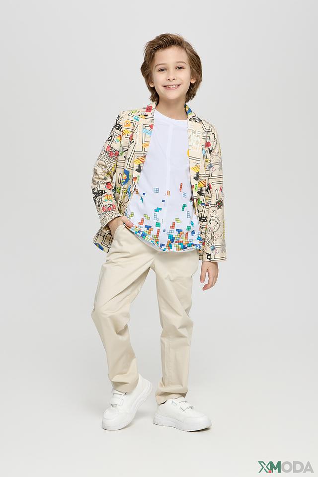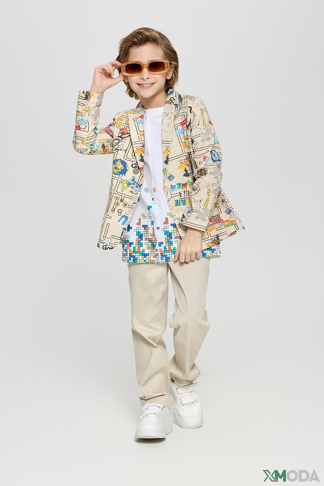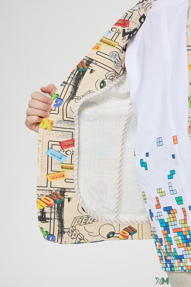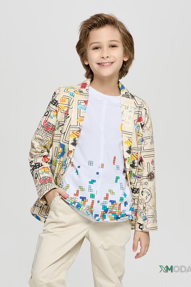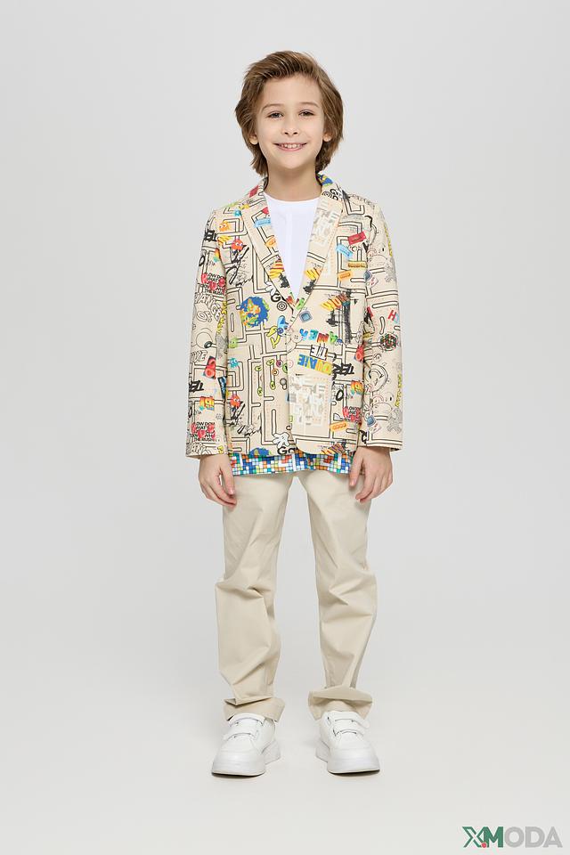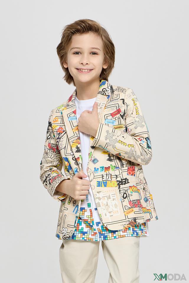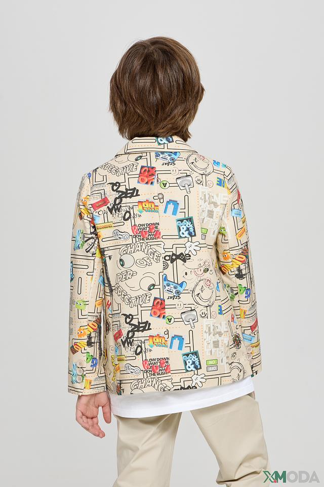 Этот стильный пиджак от Choupette станет ярким акцентом в гардеробе вашего мальчика. Пиджак выполнен в бежевом цвете и украшен красочным принтом с различными рисунками и надписями.
