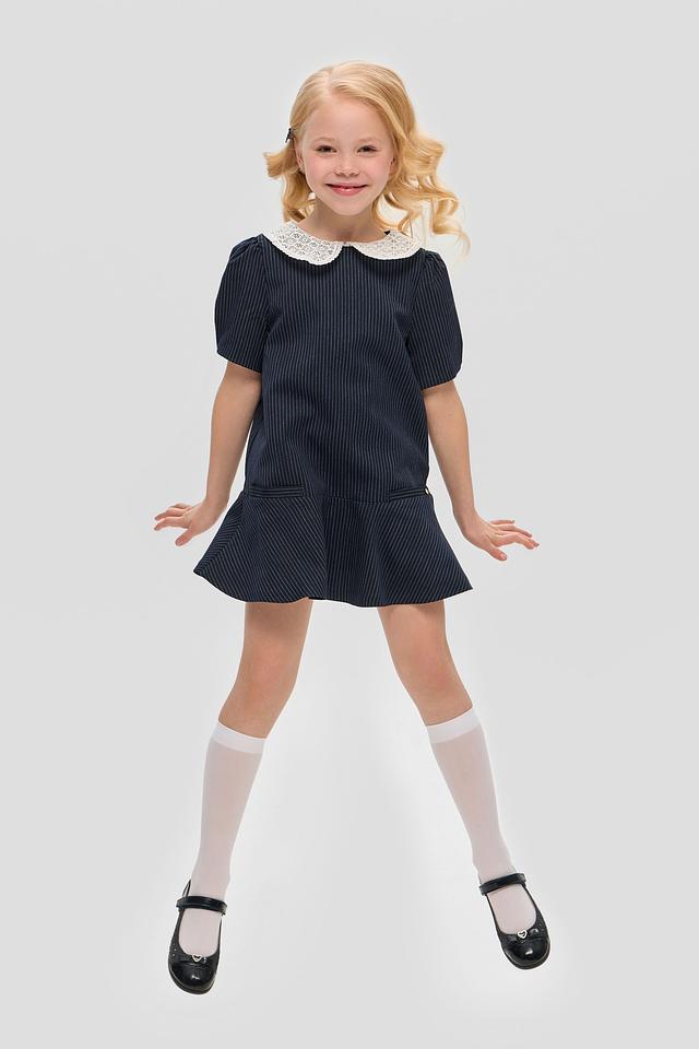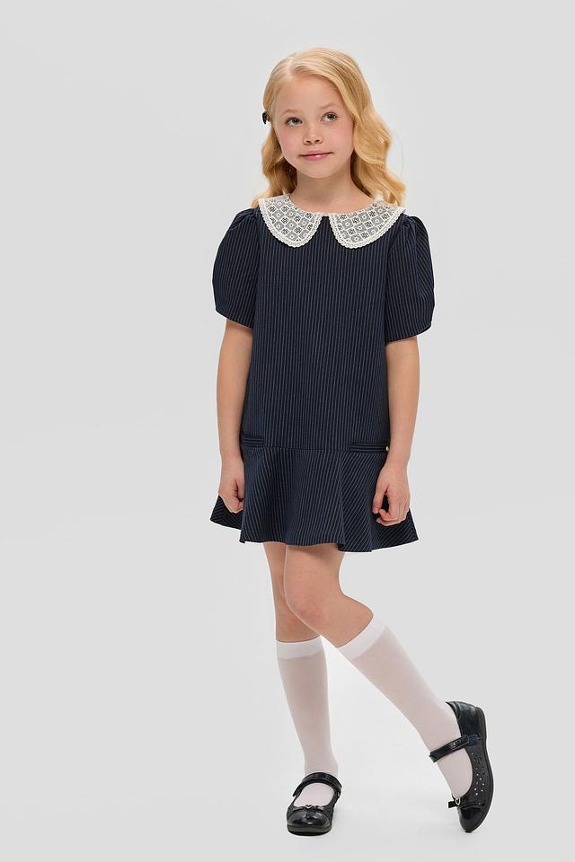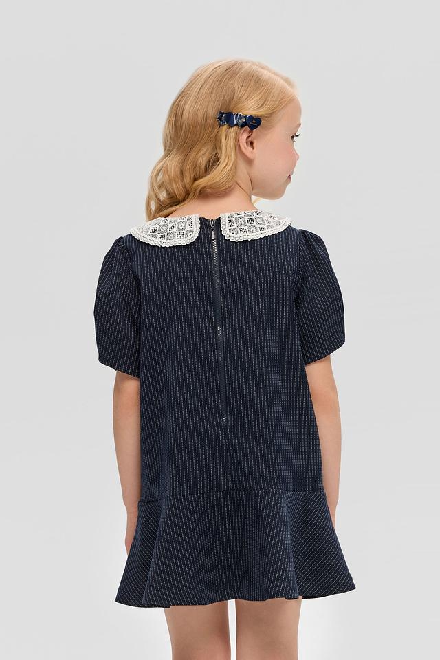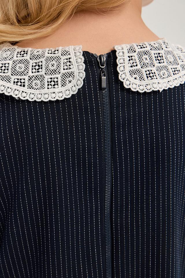 Особенностью модели является белоснежный кружевной воротник, который придает образу нежность и романтичность. Платье имеет короткие рукава-фонарики и удобную застежку-молнию на спине.