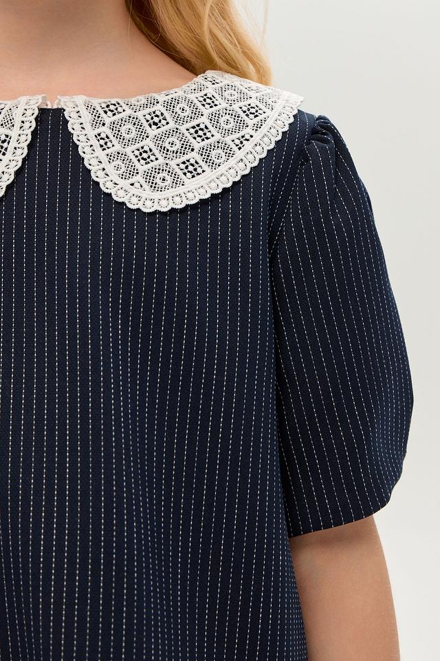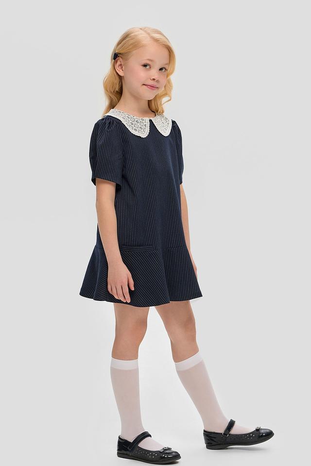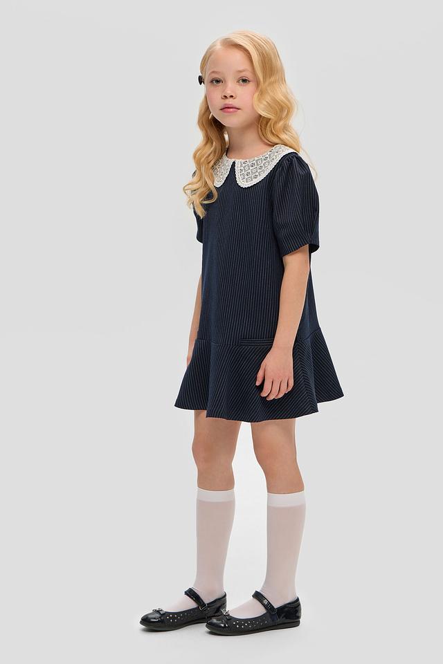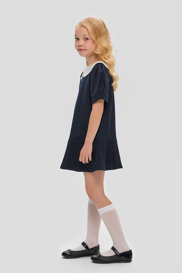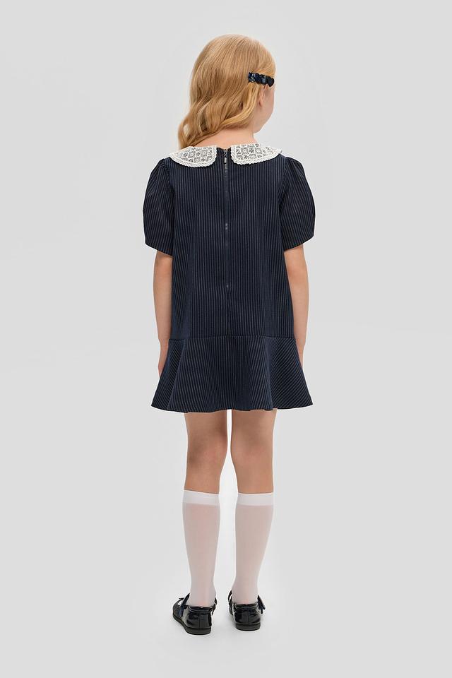 Стильное платье Choupette синего цвета в тонкую полоску с белоснежным кружевным воротником. Изготовлено из приятной на ощупь ткани с добавлением вискозы и полиэстера. Состав: Состав_подкладка вискоза 100%, полиэстер 74%, вискоза 23%, полиуретан 3%