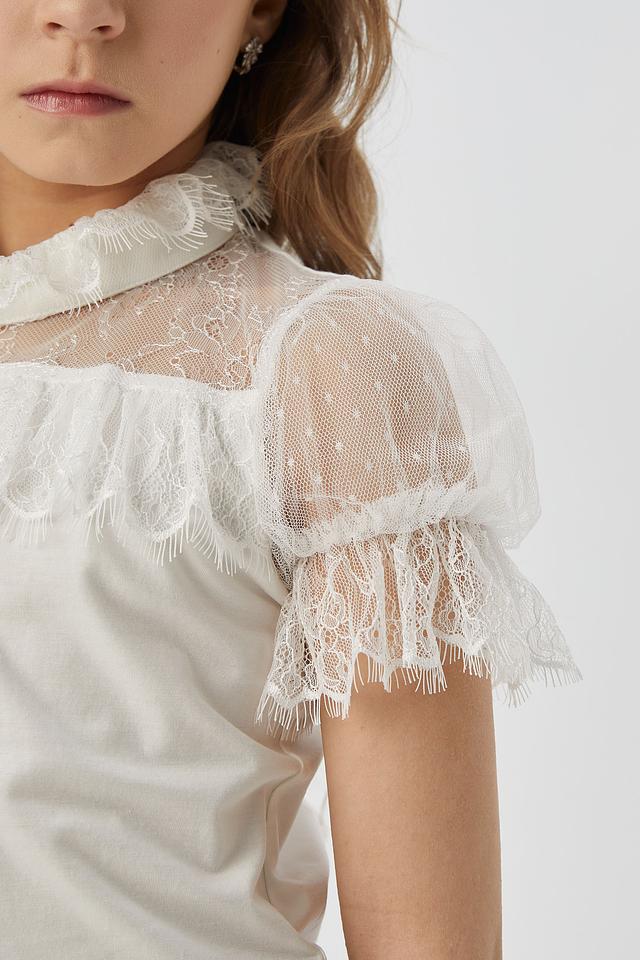 - Изысканный дизайн: Декоративные элементы, такие как нежное кружево на воротнике и по краю рукавов, а также воздушные объёмные рукава из сетки в горошек, придают блузке особую праздничность и шарм. Высокий воротник-стойка с рюшами завершает образ.