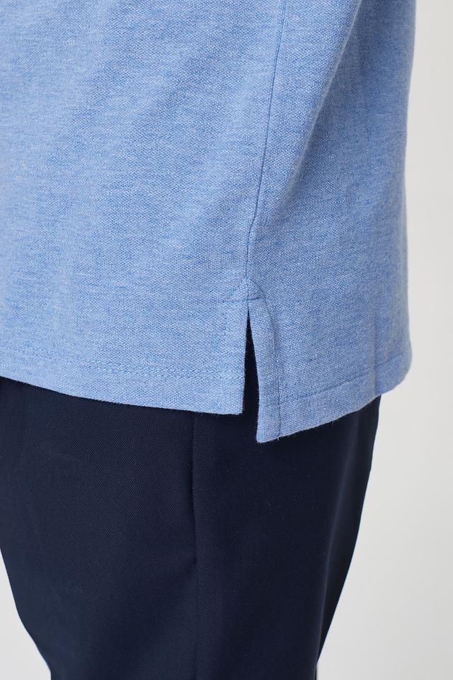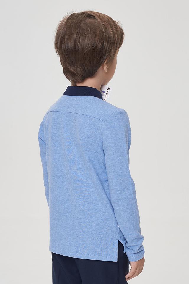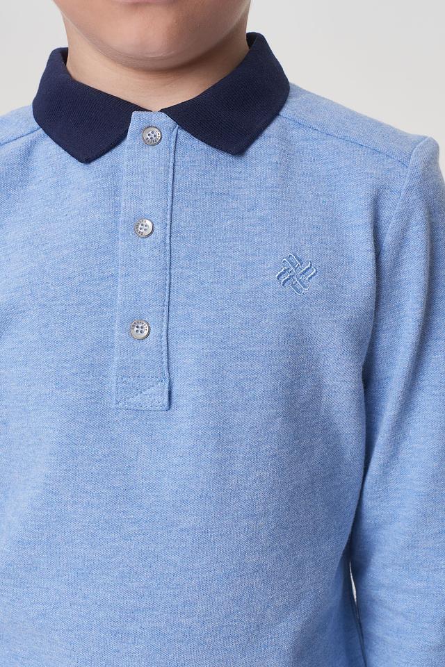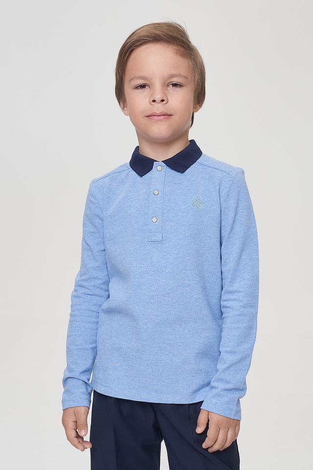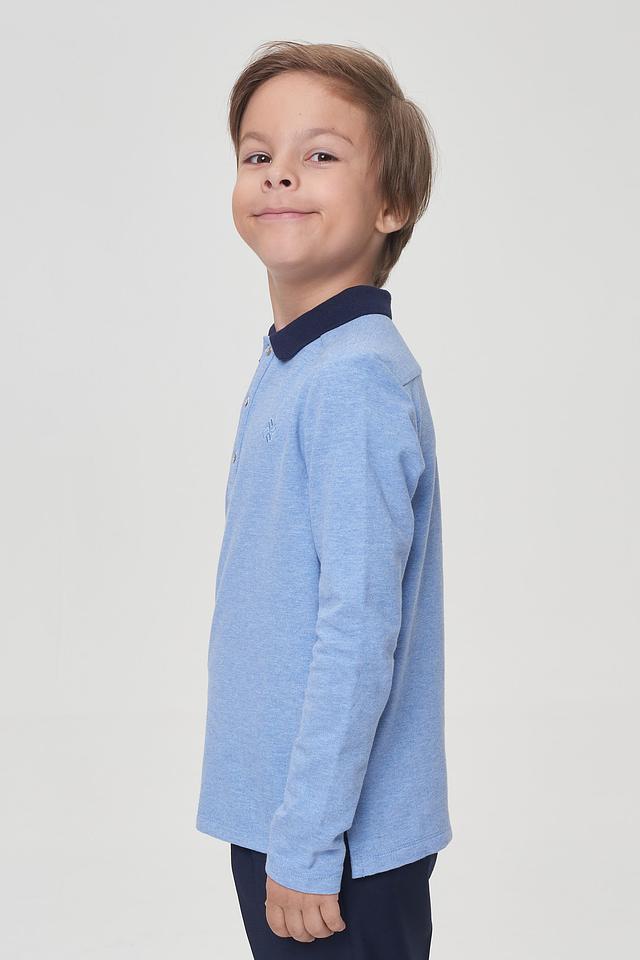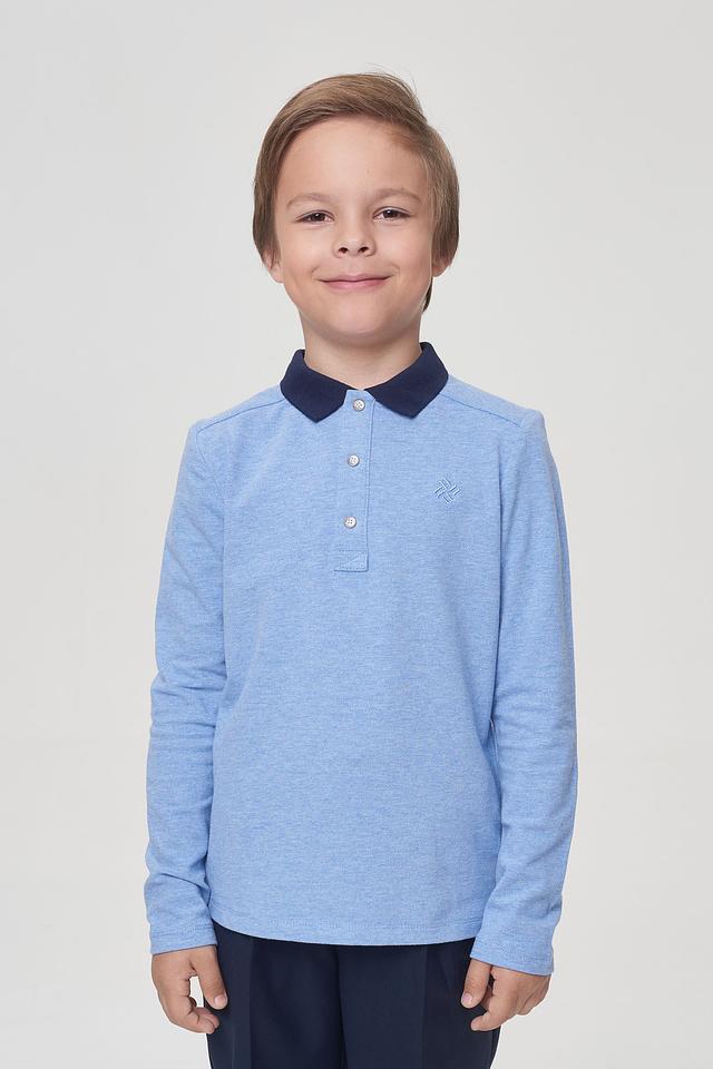 Поло имеет классический крой с длинными рукавами, что делает его подходящим для прохладной погоды. Голубой цвет изделия выглядит свежо и современно, а тёмно-синий воротник и планка с пуговицами добавляют контраста и стиля.