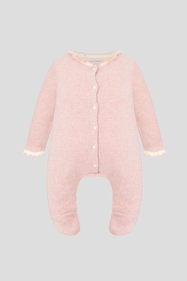 Особое внимание привлекает деликатный декор в виде оборок по горловине и на рукавах, а также вышитый логотип бренда. Комбинезон имеет закрытые ножки, что делает его идеальным выбором для прохладной погоды. Состав подкладки — 100% хлопок, что обеспечивает дополнительный комфорт и гипоаллергенность.