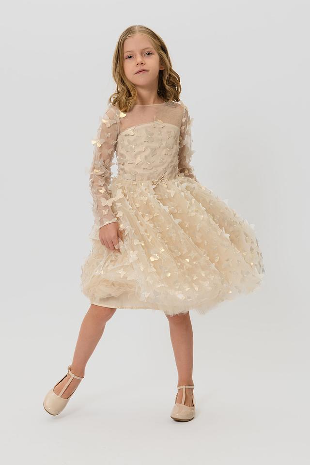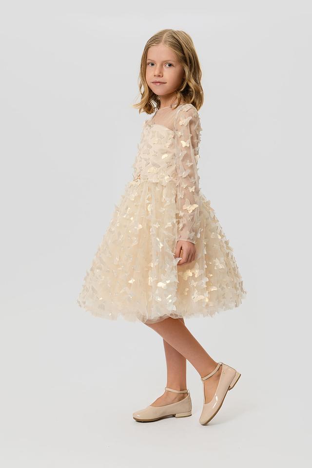 Модель имеет длинные рукава из полупрозрачной ткани, а также пышную юбку из фатина, украшенную теми же бабочками. Талия подчеркнута тонким поясом. Подкладка из 100% хлопка обеспечивает комфорт и приятные ощущения при носке.