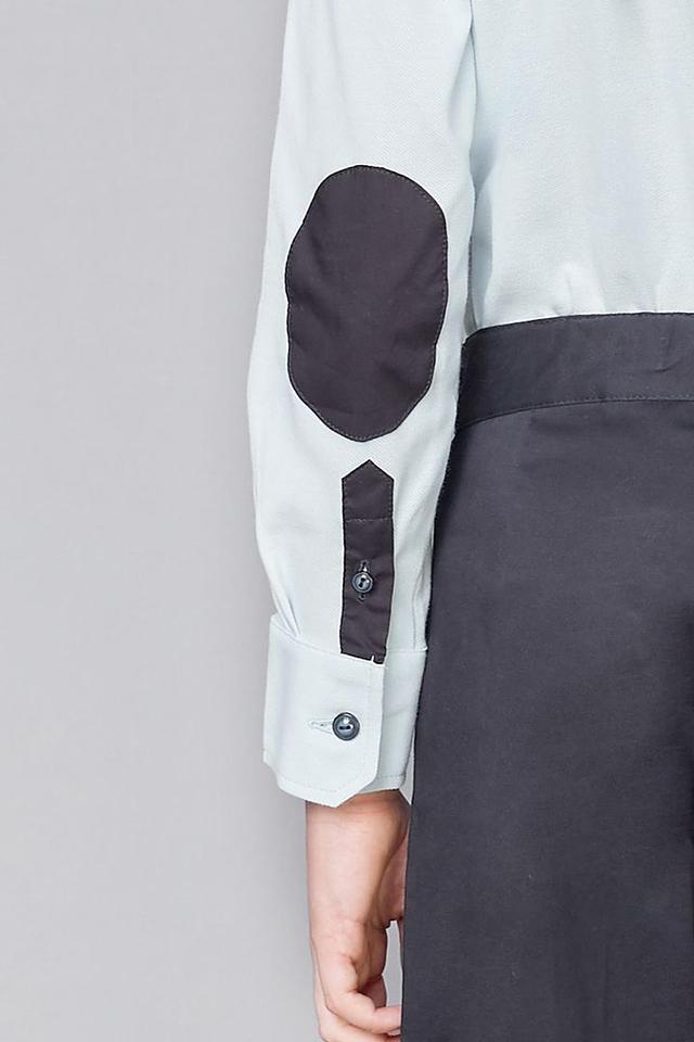 Особенностью данной модели являются накладные карманы на груди и рукавах, выполненные в тёмно-синем цвете, что придает ей стильный и аккуратный вид. Рубашка застегивается на пуговицы.
