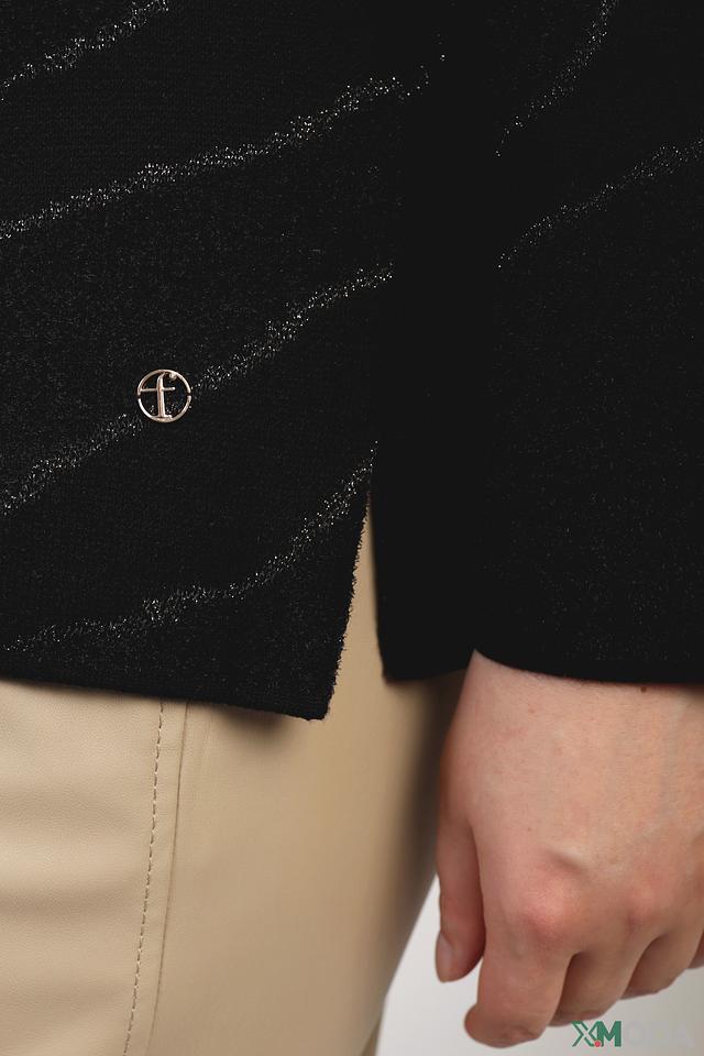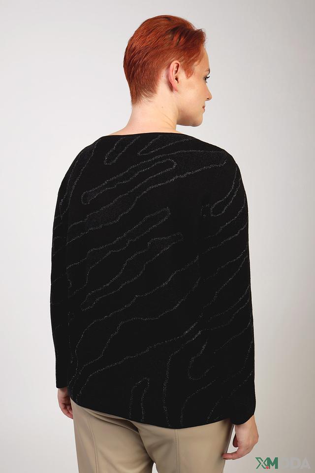 Чёрный пуловер от Frapp с оригинальным узором из блестящих нитей станет стильным дополнением к вашему гардеробу. Модель имеет свободный крой и удобный круглый вырез горловины. Состав: полиамид 46%, хлопок 26%, вискоза 18%, микрофибра 10%