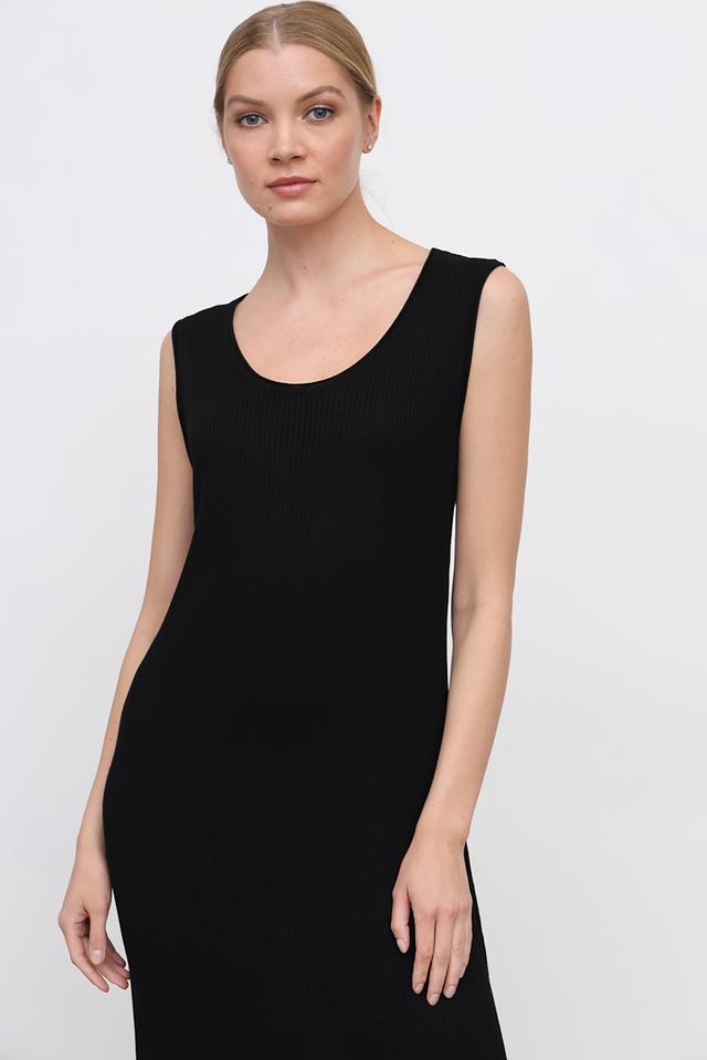 Платье имеет прямой, приталенный силуэт, который подчеркивает фигуру. Круглый вырез горловины и отсутствие рукавов делают его идеальным для тёплой погоды.