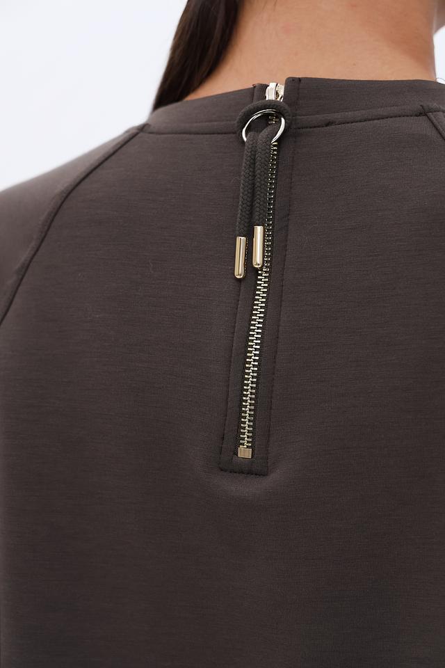 Пуловер изготовлен из высококачественного трикотажа, в составе которого полиэстер, вискоза и эластан. Благодаря этому сочетанию материалов, изделие обладает мягкостью, приятными тактильными ощущениями и хорошо держит форму. На спине расположена застежка-молния, которая обеспечивает удобство при одевании и позволяет регулировать степень открытости.