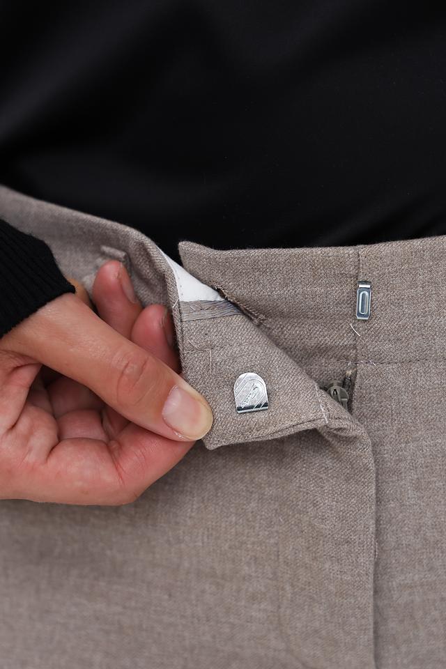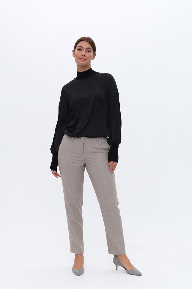 Брюки имеют классический крой с зауженными к низу штанинами, что визуально удлиняет силуэт. Застежка на молнию и пуговицу обеспечивает надежную фиксацию. Модель дополнена боковыми карманами.