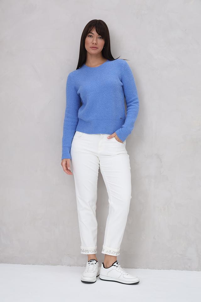 Женский пуловер Cinque голубого цвета выполнен из мягкого трикотажа с выраженной текстурой. Модель имеет круглый вырез горловины и длинные рукава, идеально подходит для создания повседневных образов. Состав: хлопок 80%, полиамид 16%, эластан 4%