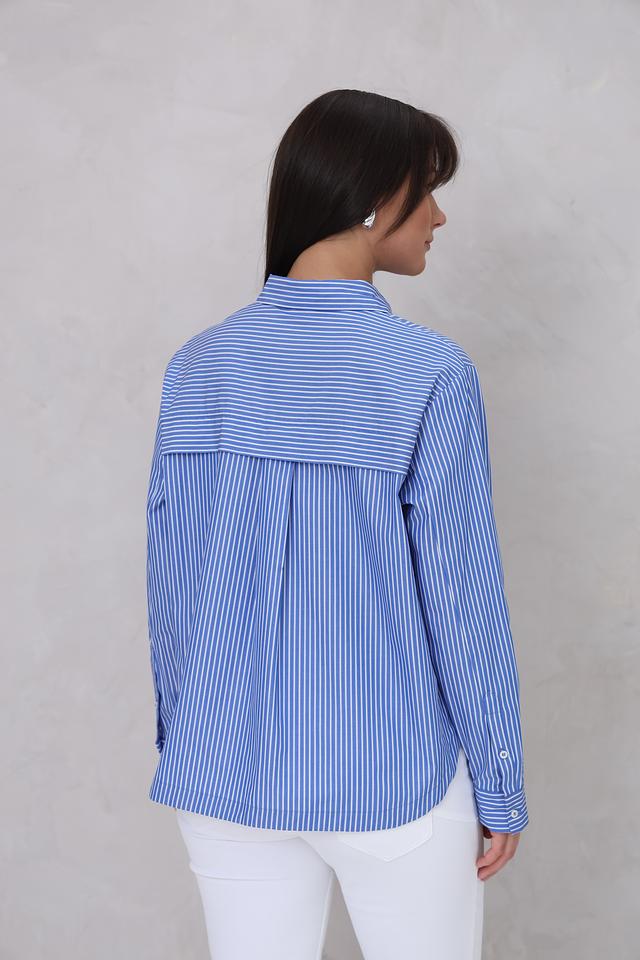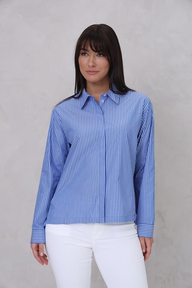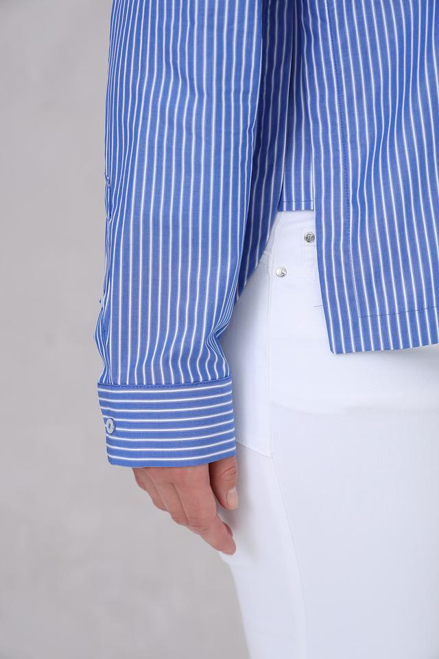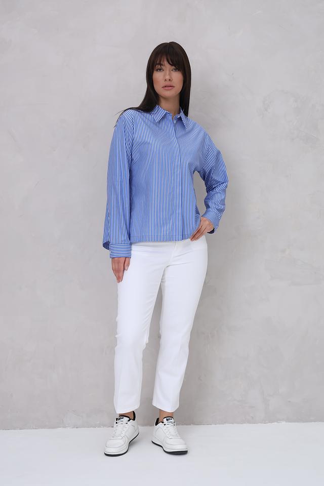 Женская рубашка Cinque голубого цвета в бело-голубую полоску. Модель выполнена из 100% хлопка, имеет длинный рукав и свободный крой. Состав: хлопок 100%