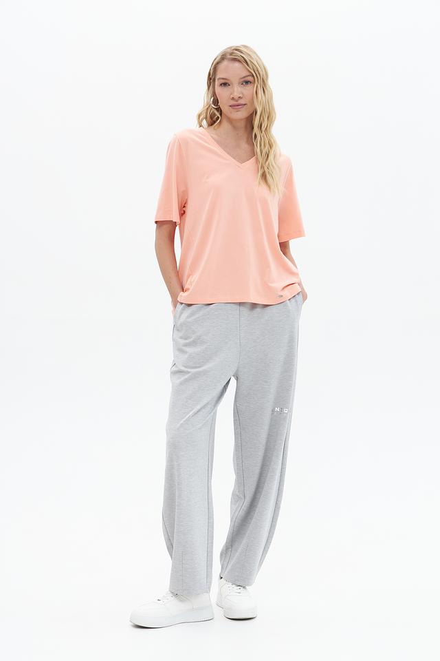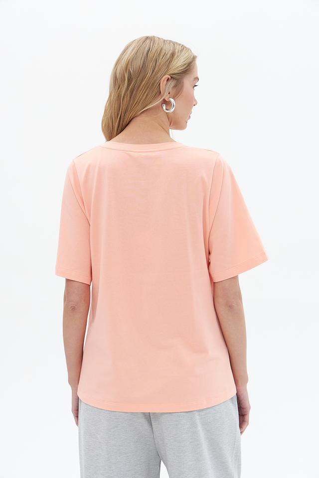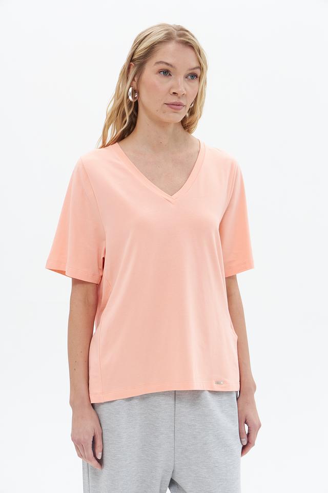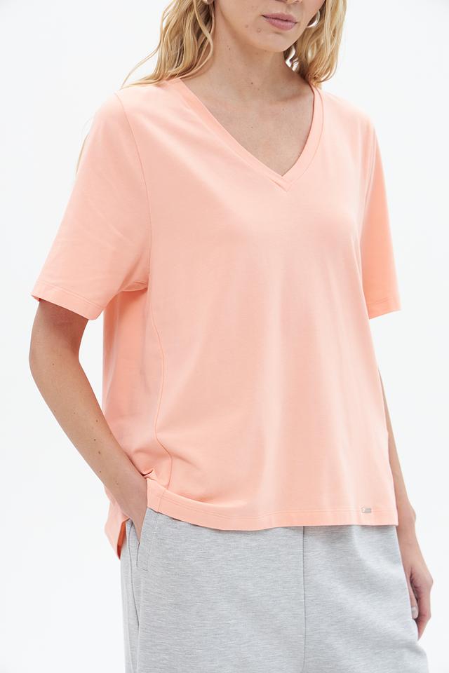 Женская футболка Cinque персикового цвета с V-образным вырезом и короткими рукавами. Изготовлена из мягкого хлопка с добавлением эластана для комфорта и свободы движений. Идеальный выбор для повседневного образа. Состав: хлопок 95%, эластан 5%