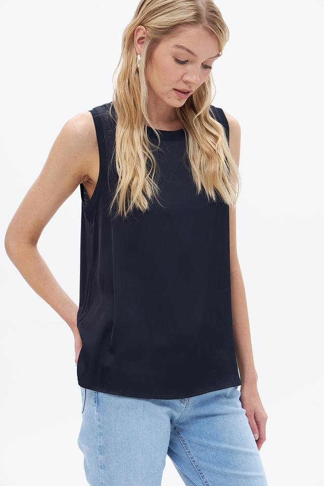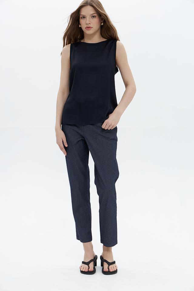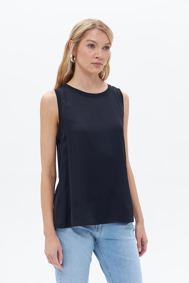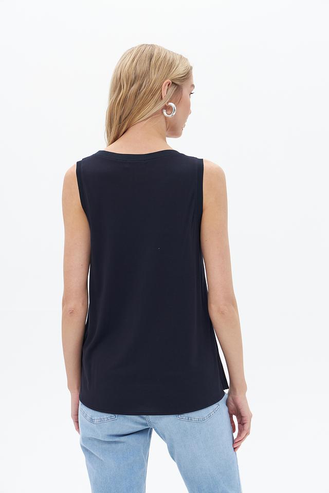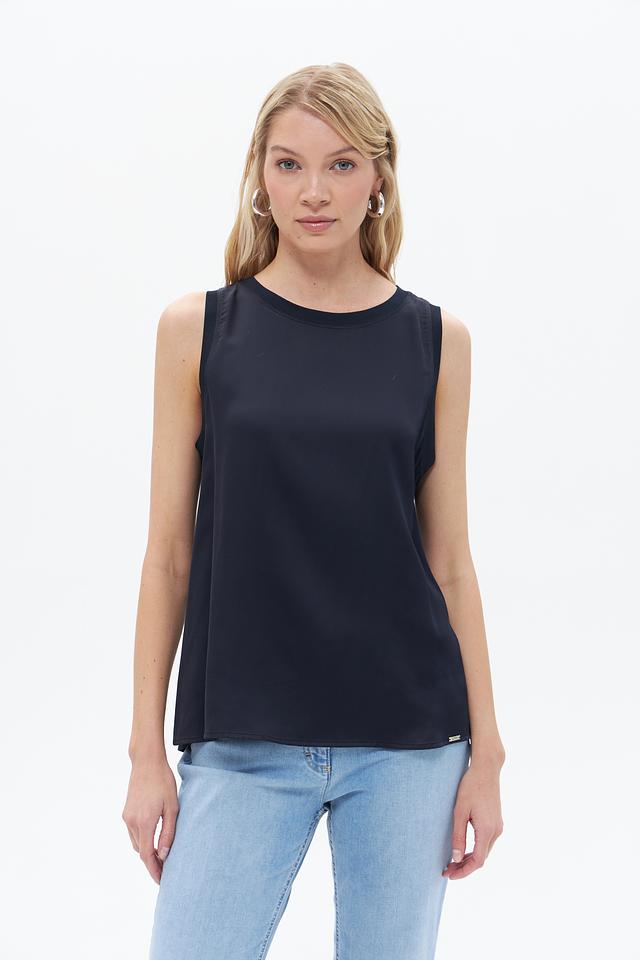 Топ имеет классический крой с круглым вырезом горловины и широкими бретелями, что делает его универсальным для различных типов фигур. Тёмно-синий цвет топа легко сочетается с другими элементами одежды, позволяя создавать разнообразные образы.