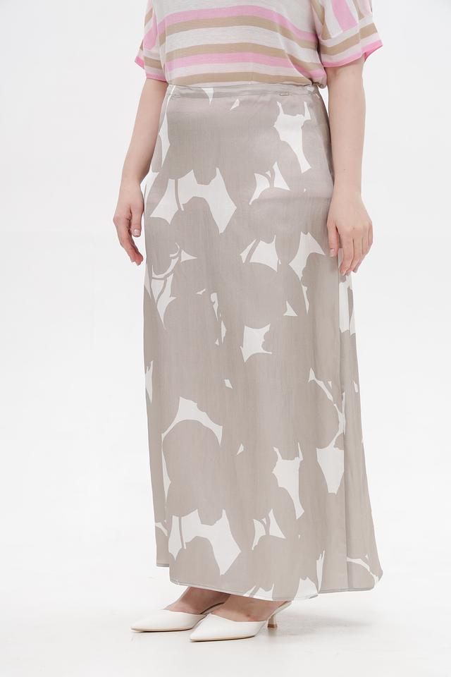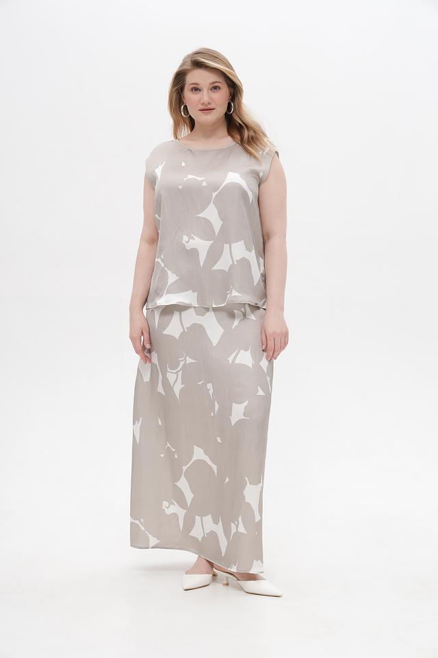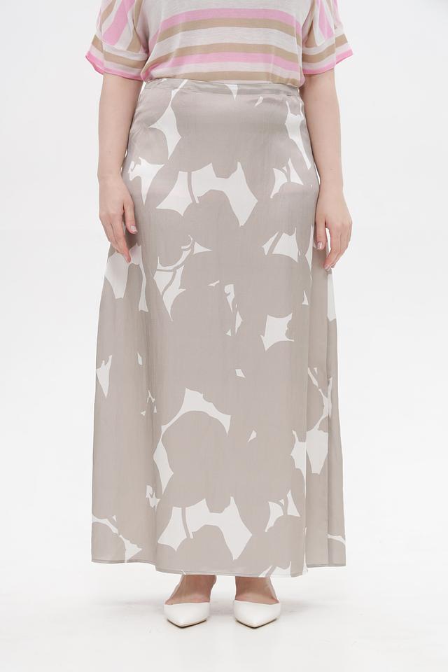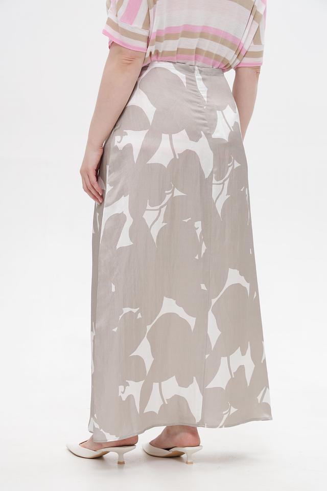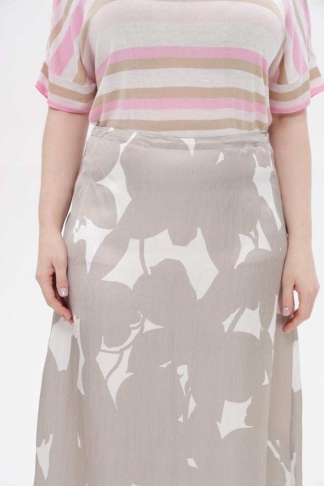Юбка имеет длину макси и свободный крой, что позволяет ей красиво драпироваться и подходить для разных типов фигур. Особенностью модели является оригинальный принт в виде абстрактных цветочных мотивов белого цвета на бежевом фоне.