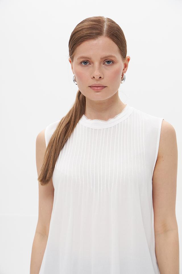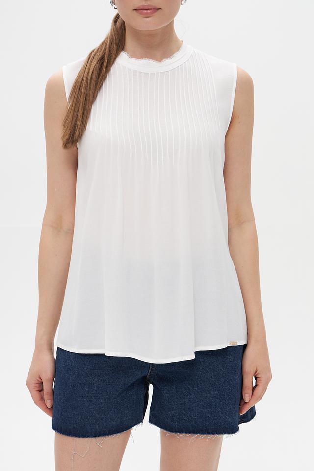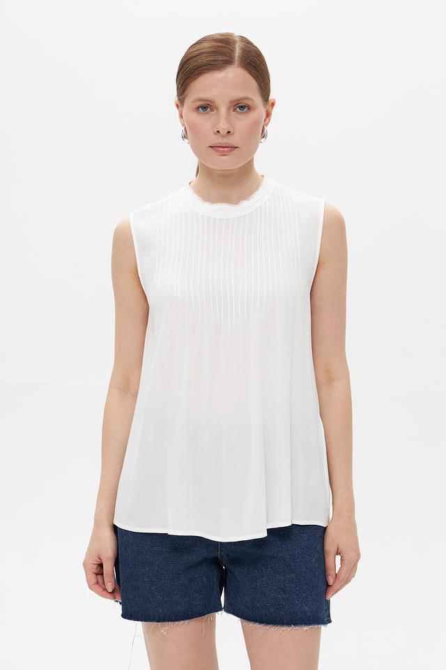 - Универсальность: Белый цвет и лаконичный крой позволяют сочетать эту майку с брюками, юбками и джинсами.