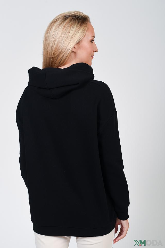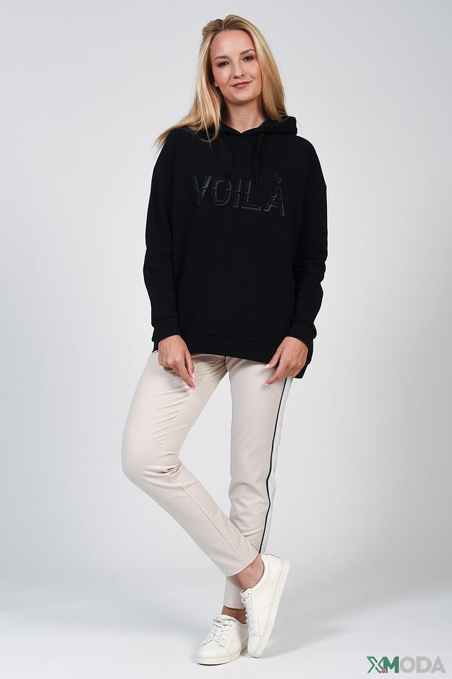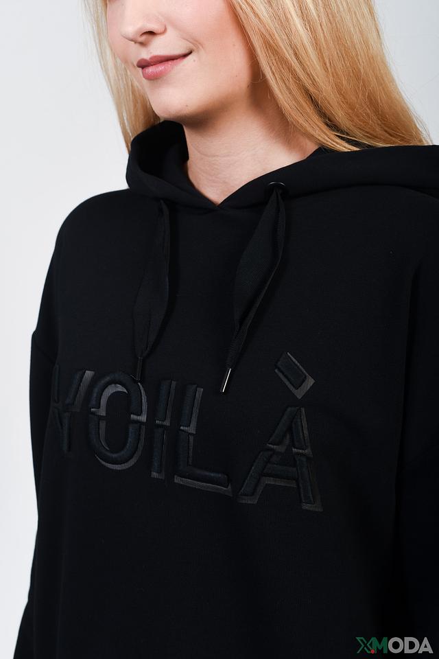 Пуловер имеет свободный крой и капюшон, что делает его идеальным для создания расслабленных образов. На передней части изделия расположена надпись "VOILA", выполненная в тон ткани, что придает ему особый шарм.