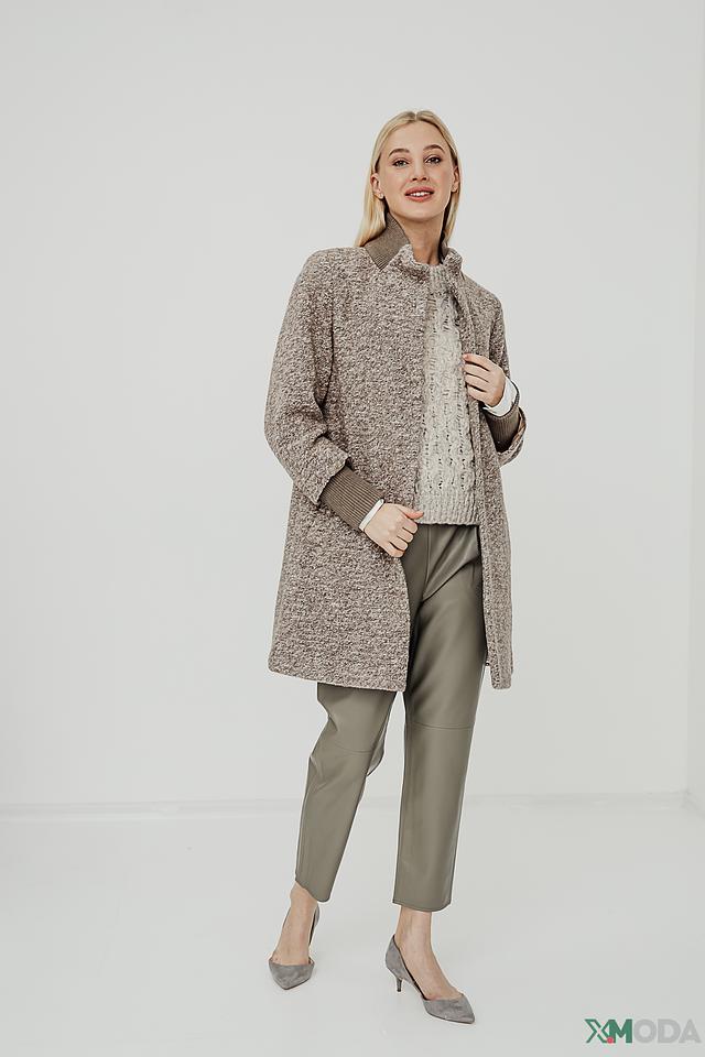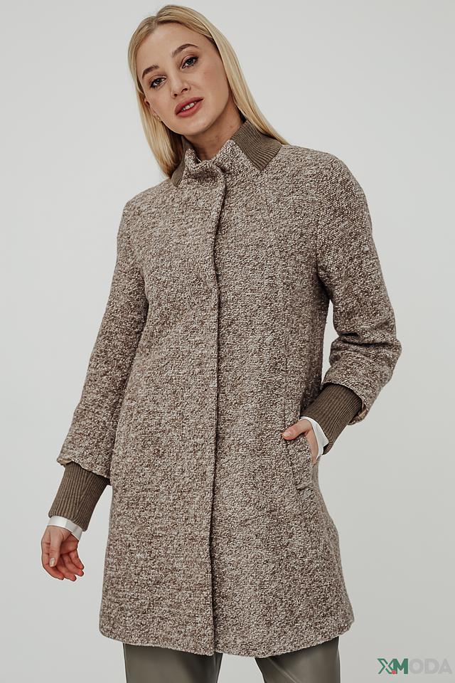 Пальто имеет прямой крой, который подходит для большинства типов фигур. Воротник-стойка добавляет элегантности, а манжеты в рубчик создают интересный акцент.