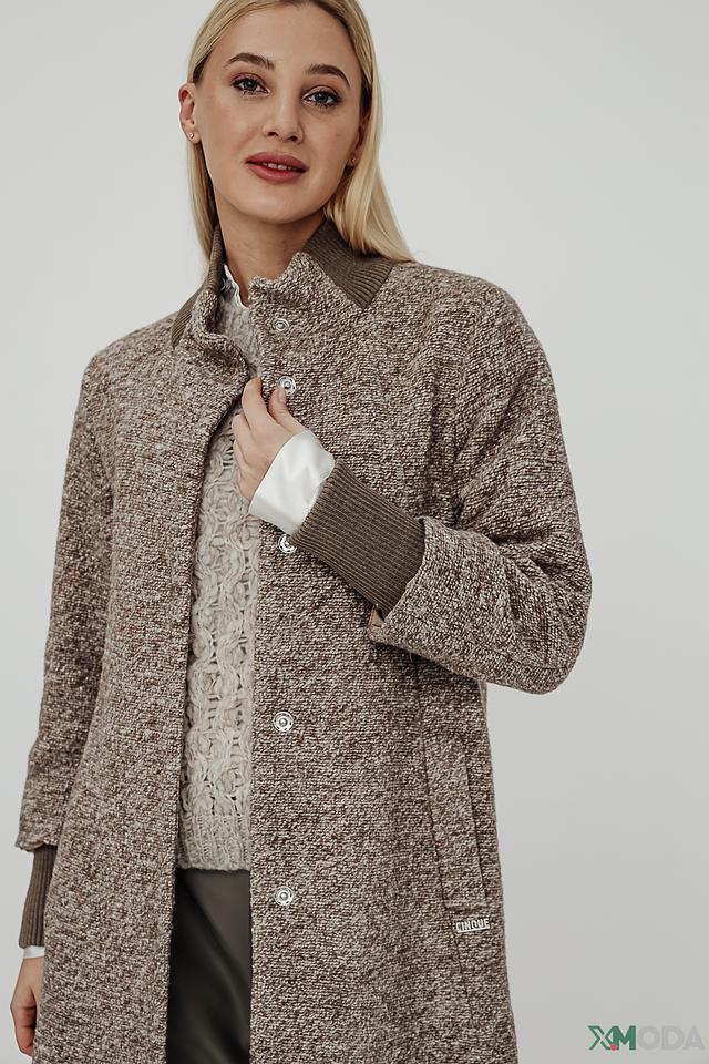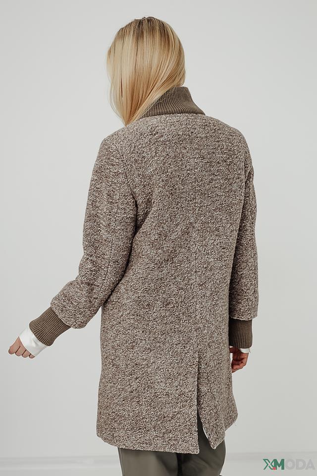 Основной цвет пальто – меланж, сочетающий в себе оттенки коричневого и серого. Застежка выполнена на пуговицы. Пальто имеет два боковых кармана.