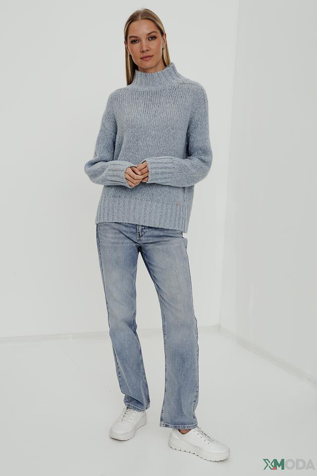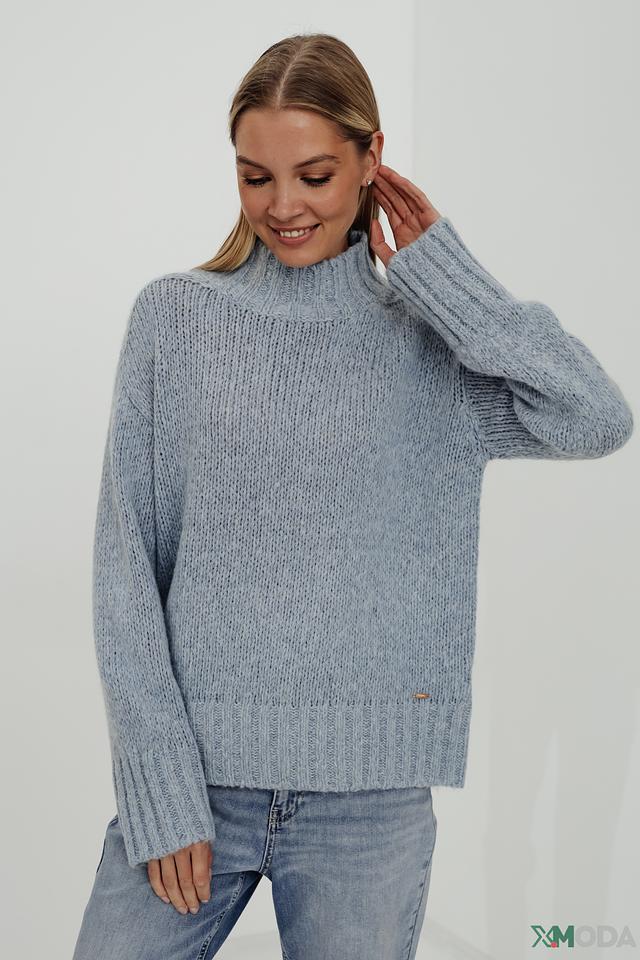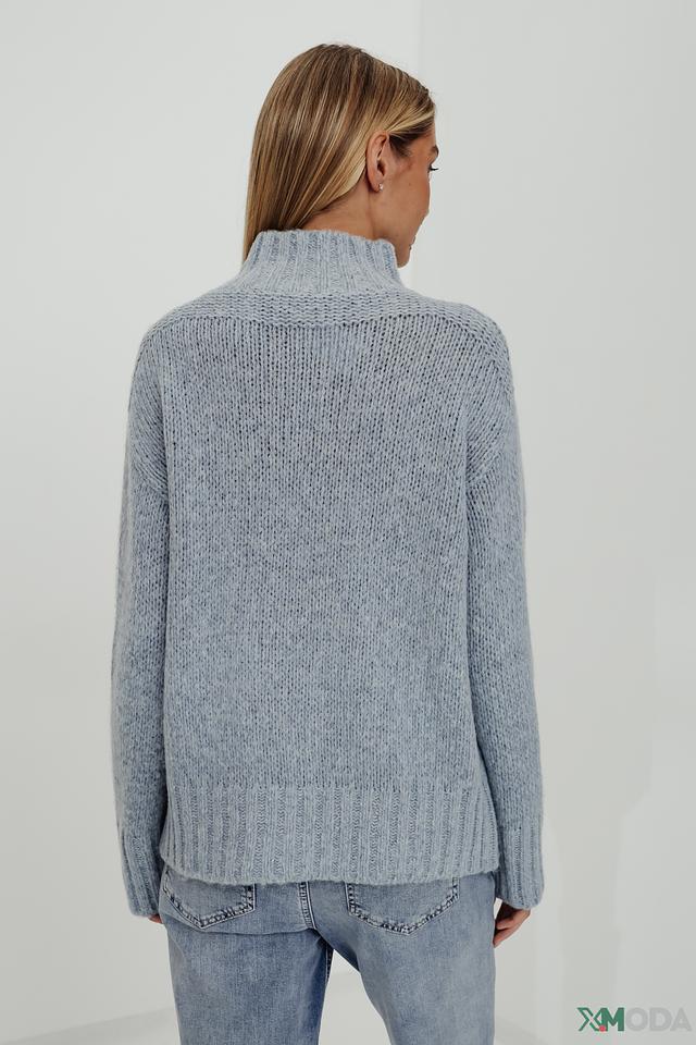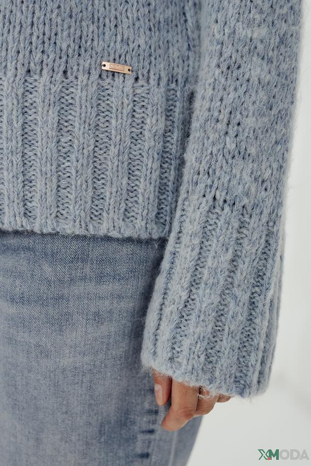 Пуловер имеет свободный крой, высокий горл и объёмную текстуру крупной вязки. Голубой цвет изделия придаёт ему свежесть и универсальность, позволяя легко сочетать его с различными элементами одежды.