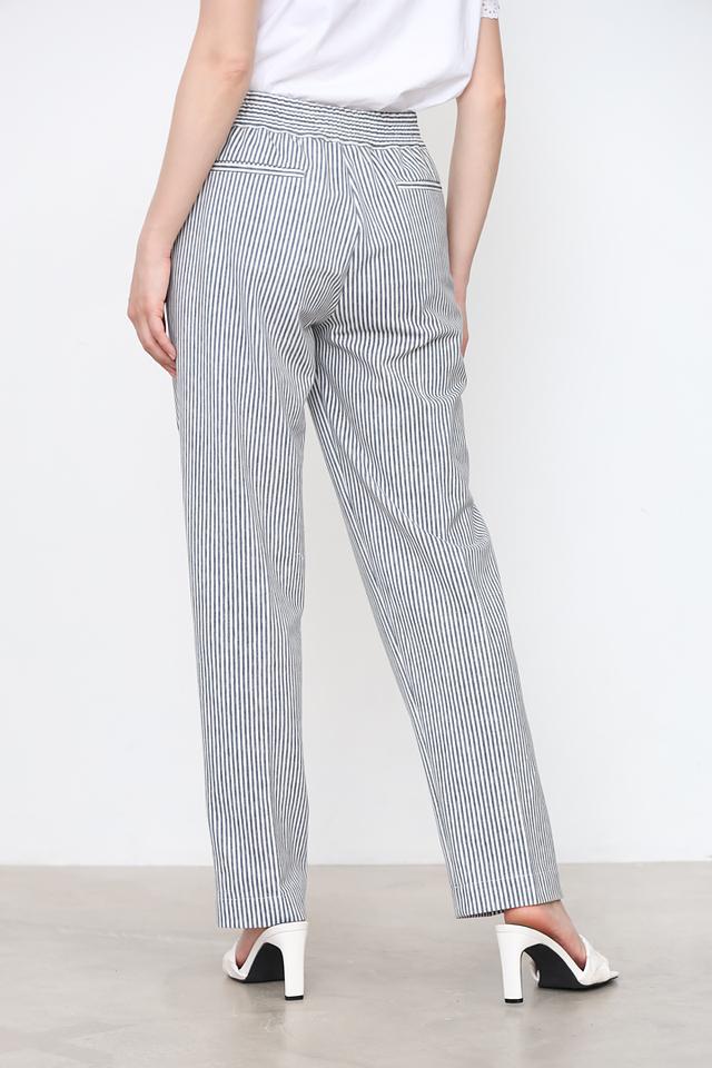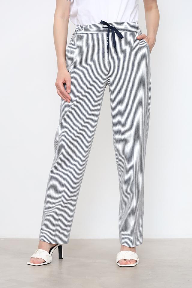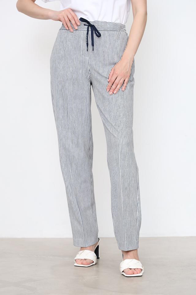 Женские брюки Circolo 1901 синего и белого цвета в классическую полоску. Модель выполнена из хлопка с добавлением эластана для комфорта и свободы движений, имеет удобный пояс на резинке и завязки. Состав: хлопок 97%, эластан 3%