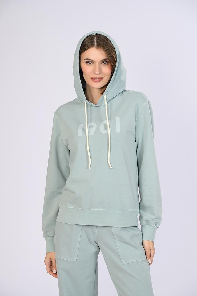 Бирюзовый джемпер Circolo 1901 с капюшоном и надписью "1901" — удобная и стильная модель для повседневной носки. Изготовлен из мягкого хлопка с добавлением эластана для комфорта и свободы движений. Состав: хлопок 93%, эластан 7%