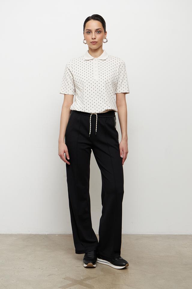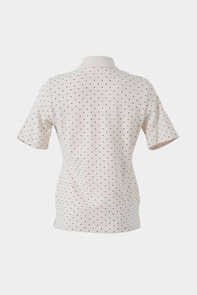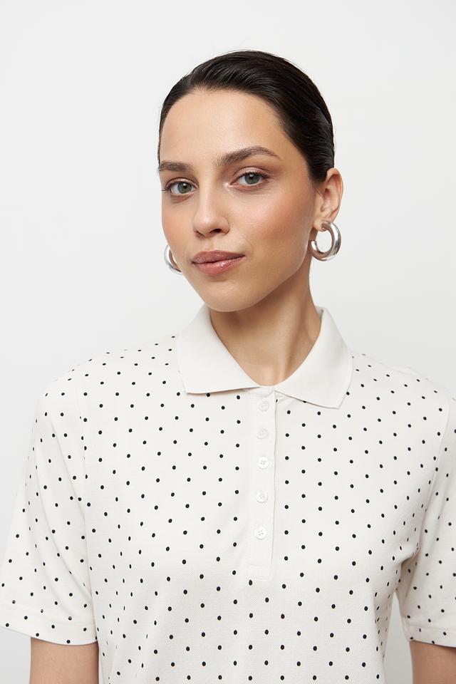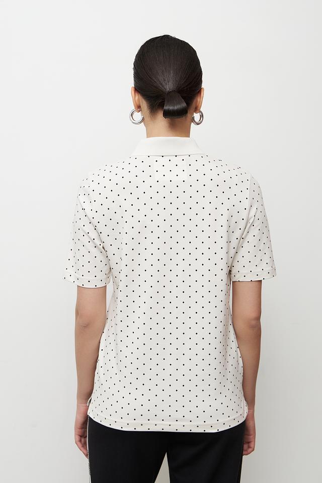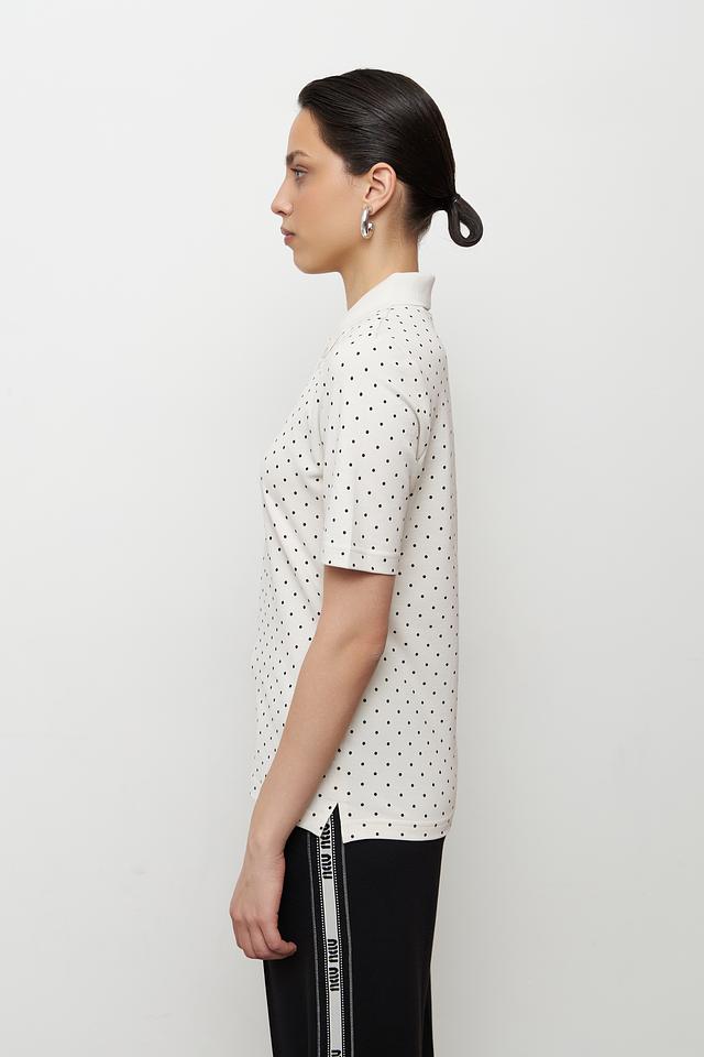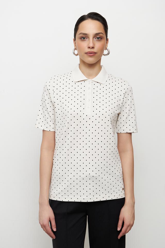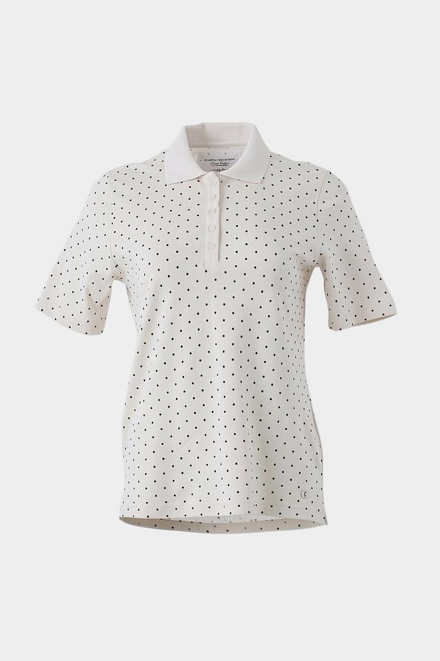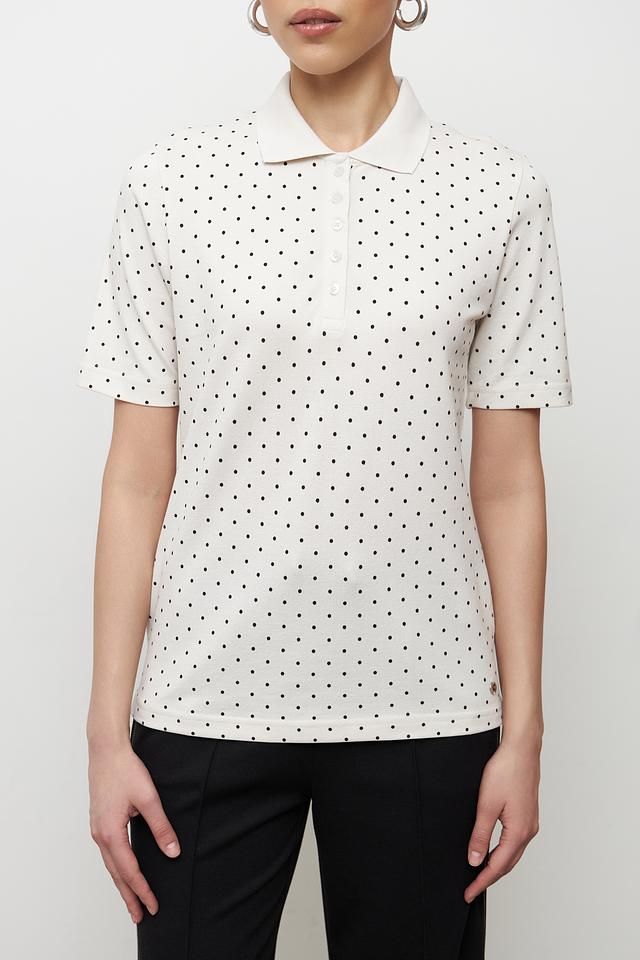 Это поло от бренда Clarina выполнено в белом цвете и украшено мелким чёрным горошком, что придает ему элегантный и свежий вид. Модель имеет классический крой поло с короткими рукавами и воротником, выполненным в рубчик.