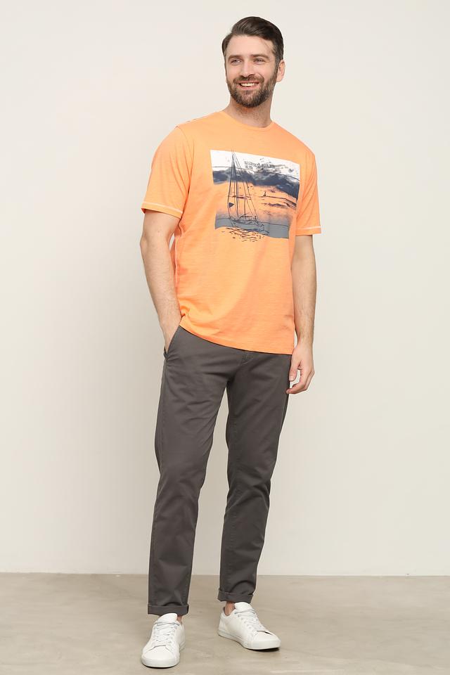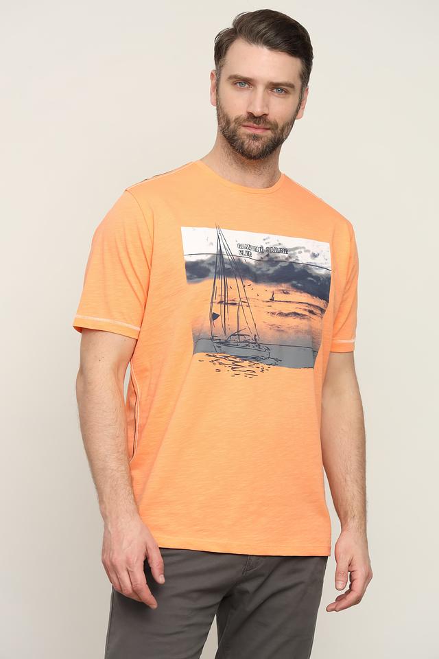 Мужская футболка от Claudio Campione выполнена в ярком оранжевом цвете и украшена эффектным принтом с изображением парусника на фоне морского пейзажа.