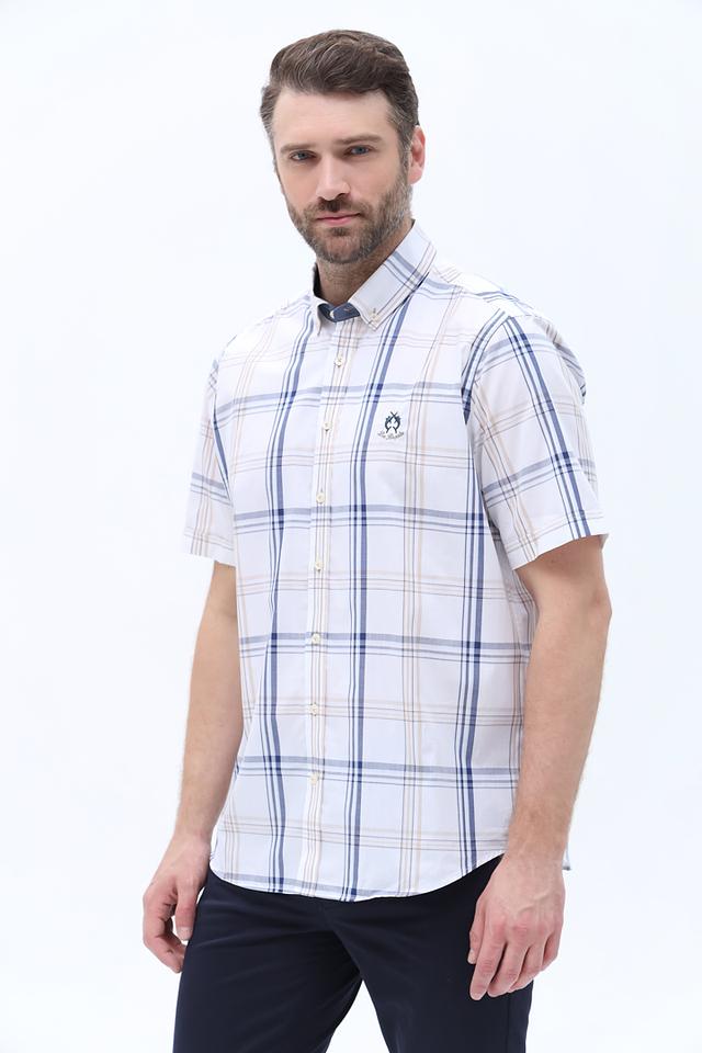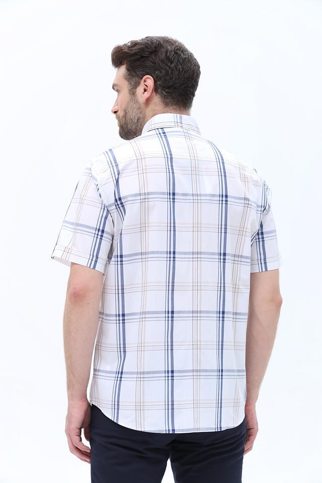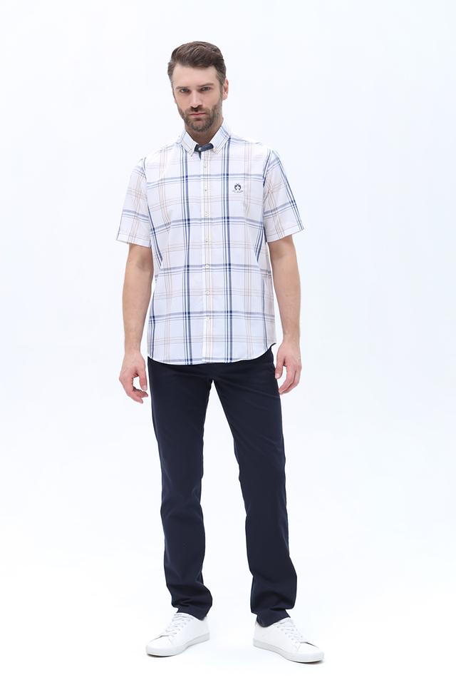 Основной цвет рубашки – белый, но благодаря клетчатому рисунку в ней присутствуют оттенки голубого, бежевого и светло-коричневого. Такое сочетание цветов придает рубашке свежий и современный вид.