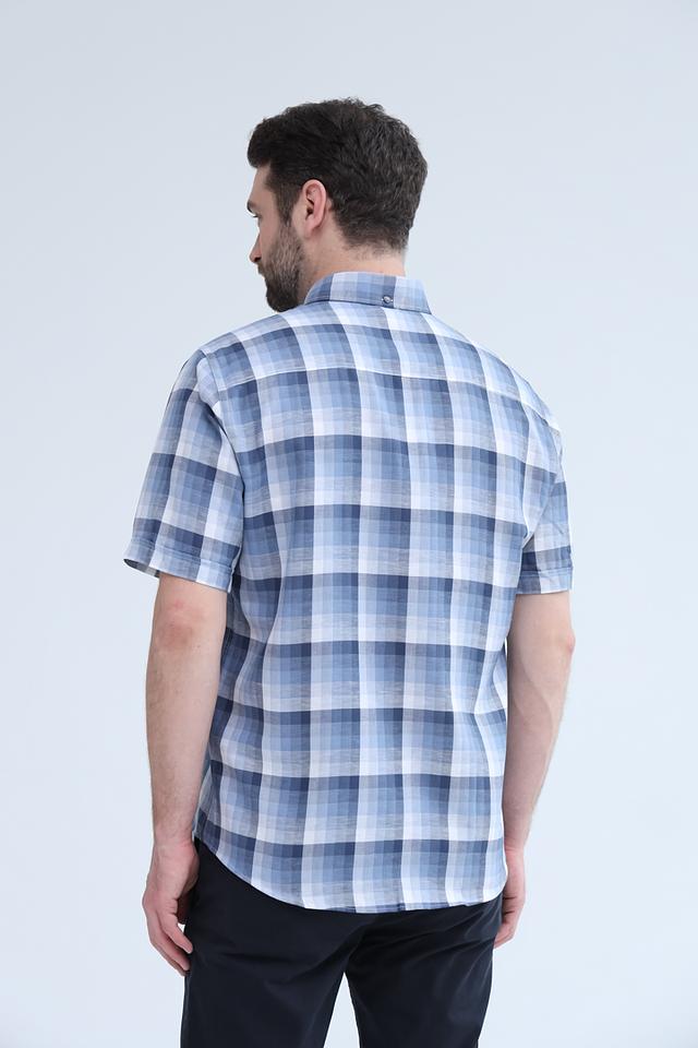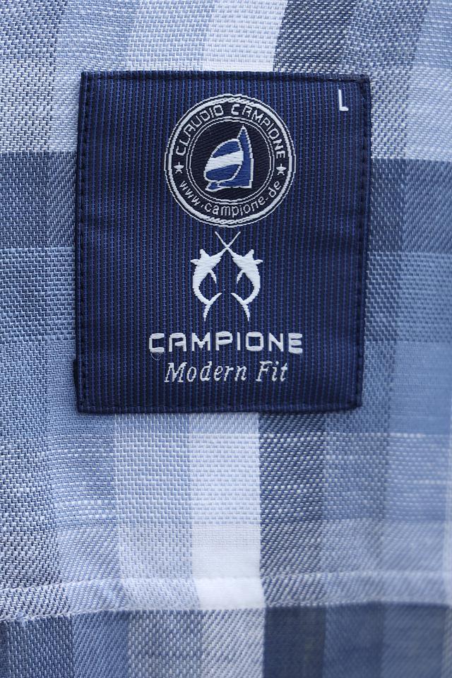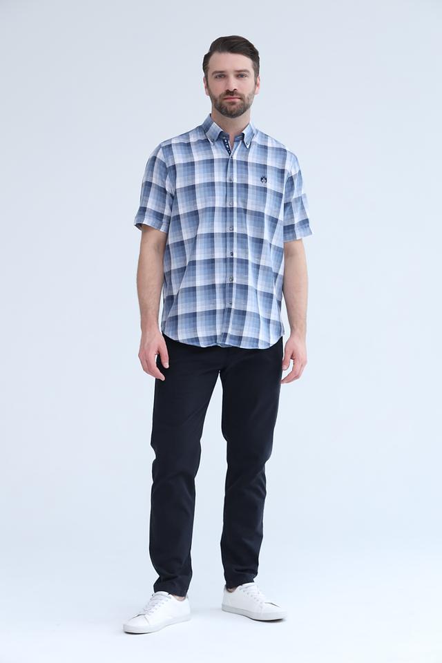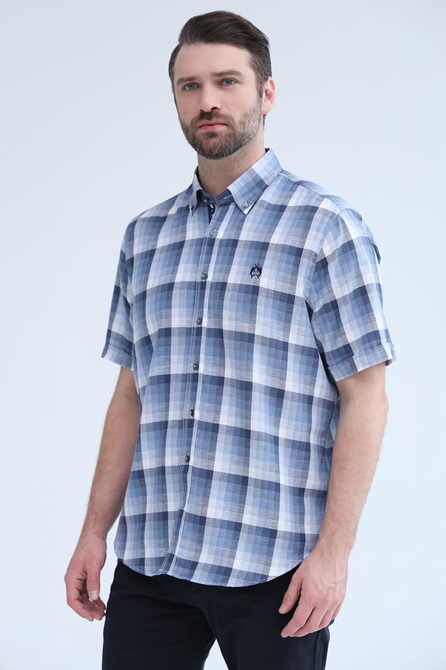 Мужская рубашка с коротким рукавом Claudio Campione голубого цвета в классическую клетку. Изготовлена из хлопка с добавлением льна, что обеспечивает комфорт и воздухопроницаемость в жаркую погоду. Состав: хлопок 90%, лен 10%