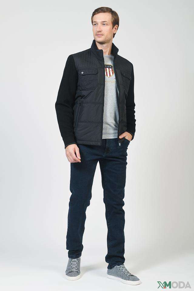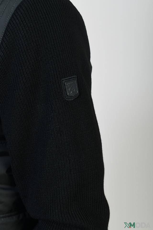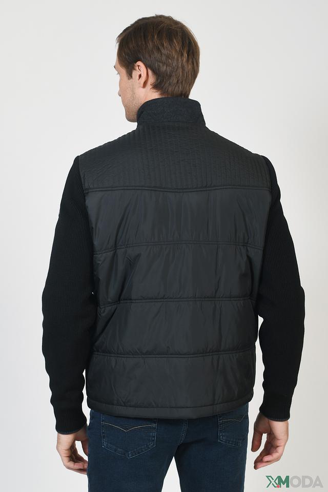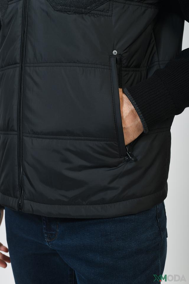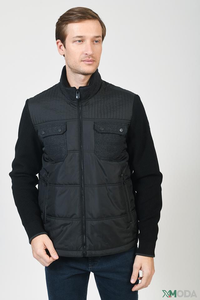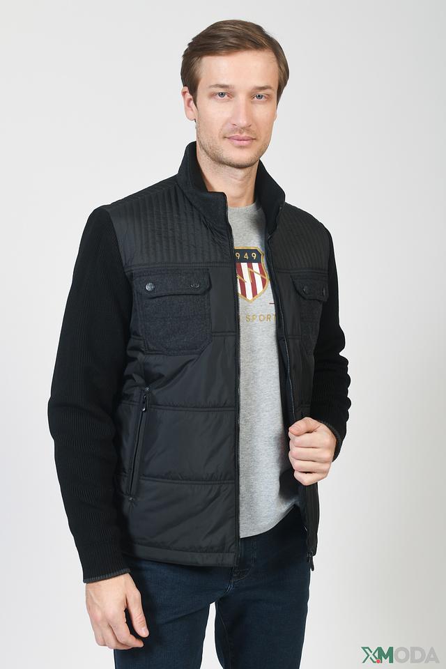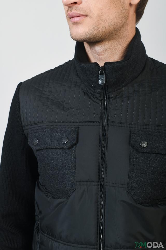 Куртка выполнена в чёрном цвете с элементами из трикотажа на рукавах и воротнике, что придает ей особый стиль. Передняя часть куртки стеганая, с двумя накладными карманами на кнопках. Застежка – молния, обеспечивающая удобство и надежность.