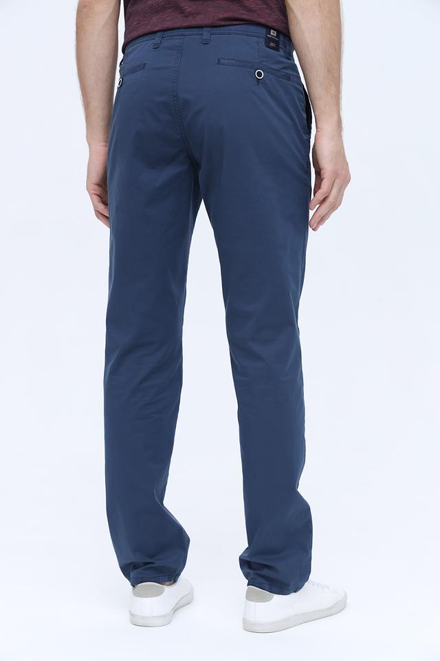 Брюки имеют стандартную ширину штанин и длину. Застежка на молнию и пуговицу. Модель дополнена двумя боковыми и двумя задними карманами. Цвет брюк – насыщенный синий.
