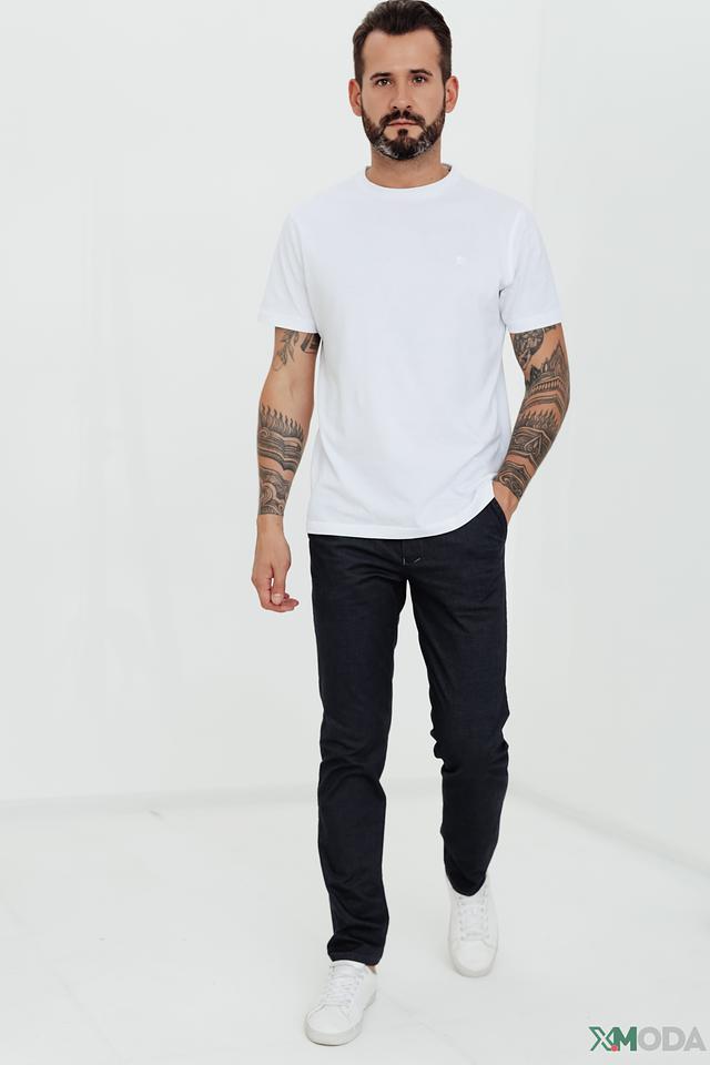 На заднем кармане расположена декоративная нашивка с логотипом бренда. Брюки застегиваются на молнию и пуговицу. Состав: 97% хлопок, 3% эластан.
