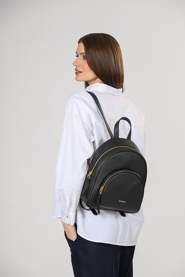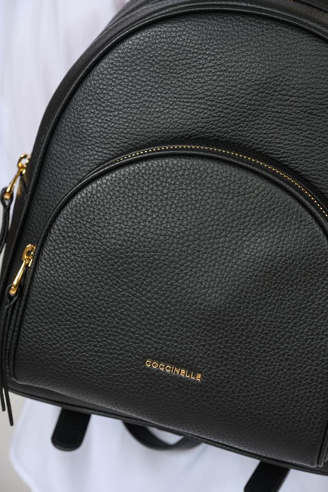 Чёрный кожаный рюкзак Coccinelle – стильный и функциональный аксессуар для повседневной жизни. Модель выполнена из высококачественной кожи с текстурированной поверхностью и дополнена золотистой фурнитурой. Состав: кожа 100%