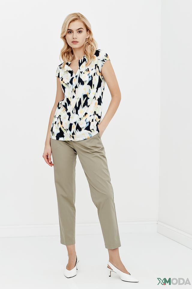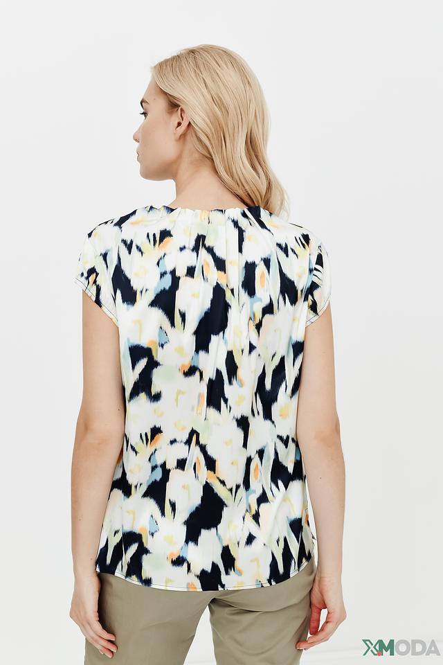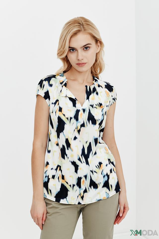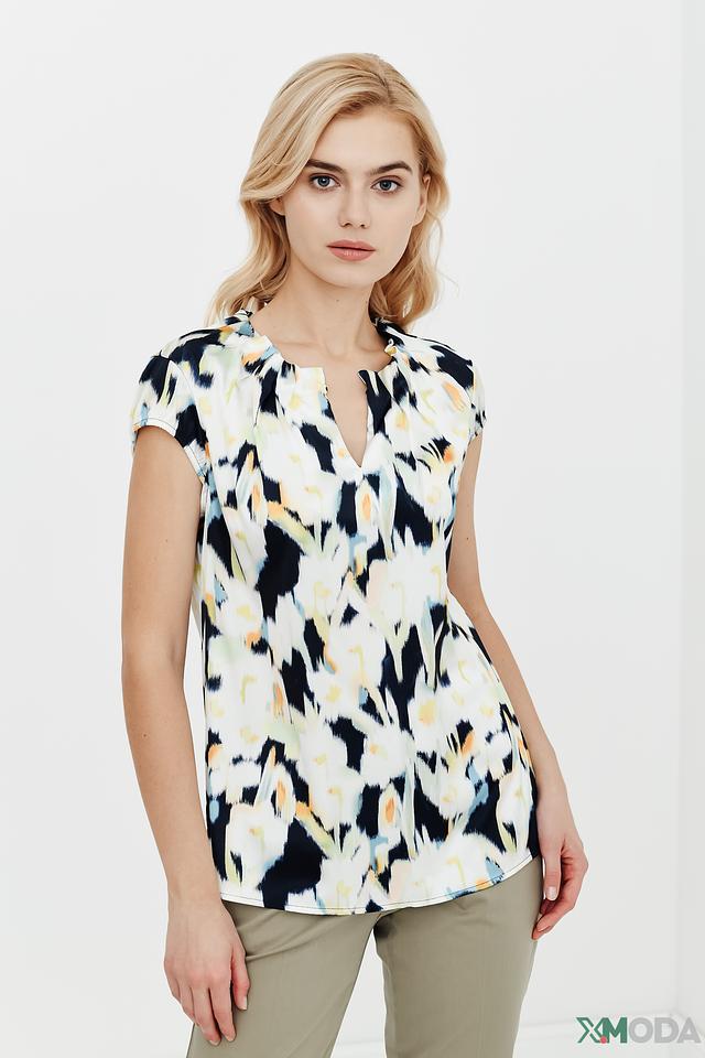 Особенностью данной модели является оригинальный абстрактный принт, сочетающий в себе оттенки синего, жёлтого и белого. V-образный вырез горловины и короткие рукава придают топу лёгкость и женственность.