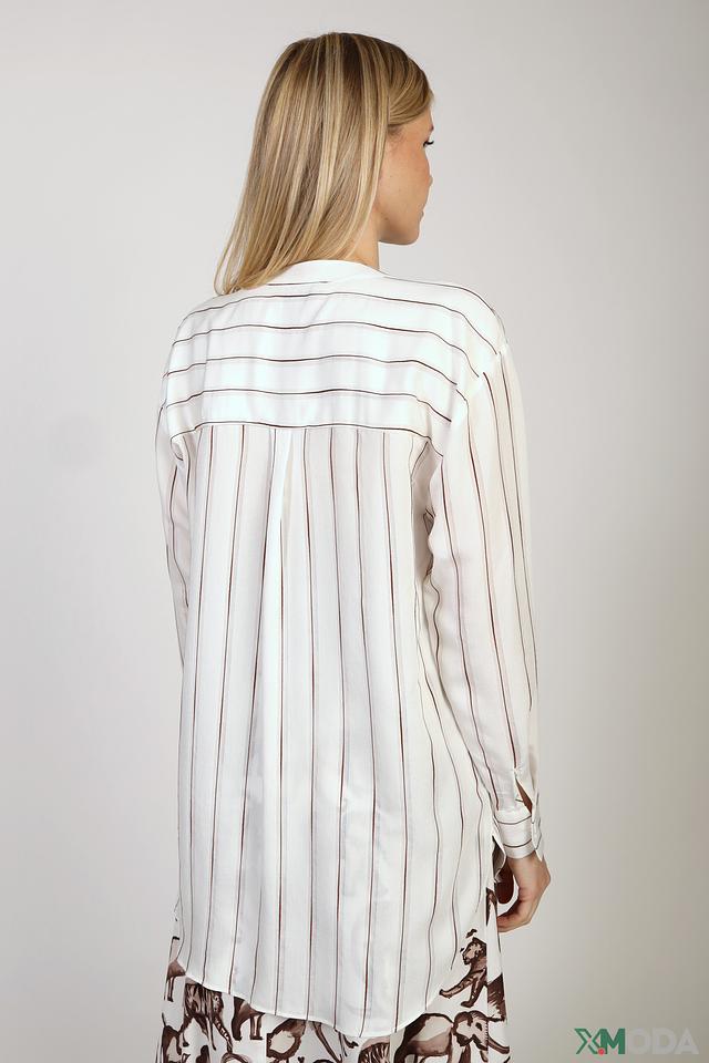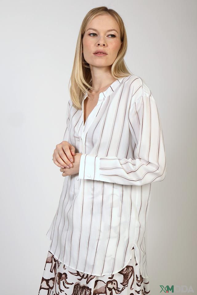 Эта блуза от Comma станет прекрасным дополнением к вашему гардеробу. Выполнена в белом цвете с вертикальной полоской коричневого оттенка, что придает ей изысканность и свежесть.