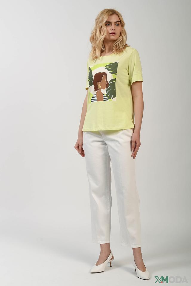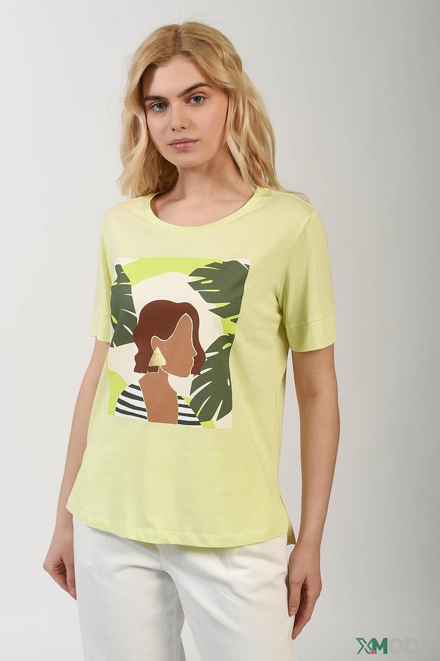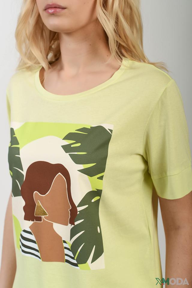 Женская футболка Comma лаймового цвета с оригинальным принтом в виде абстрактного портрета и тропических листьев. Изготовлена из 100% хлопка, обеспечивающего комфорт и воздухопроницаемость. Состав: хлопок 100%