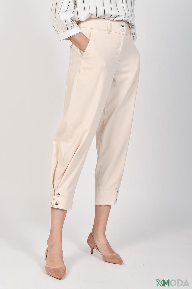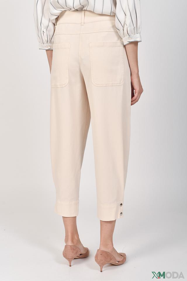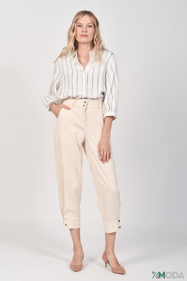 Брюки имеют свободный крой, который обеспечивает комфорт в течение всего дня. Высокая посадка подчеркивает талию и создает женственный силуэт. Декоративные пуговицы на поясе и по бокам добавляют брюкам изысканности и оригинальности.