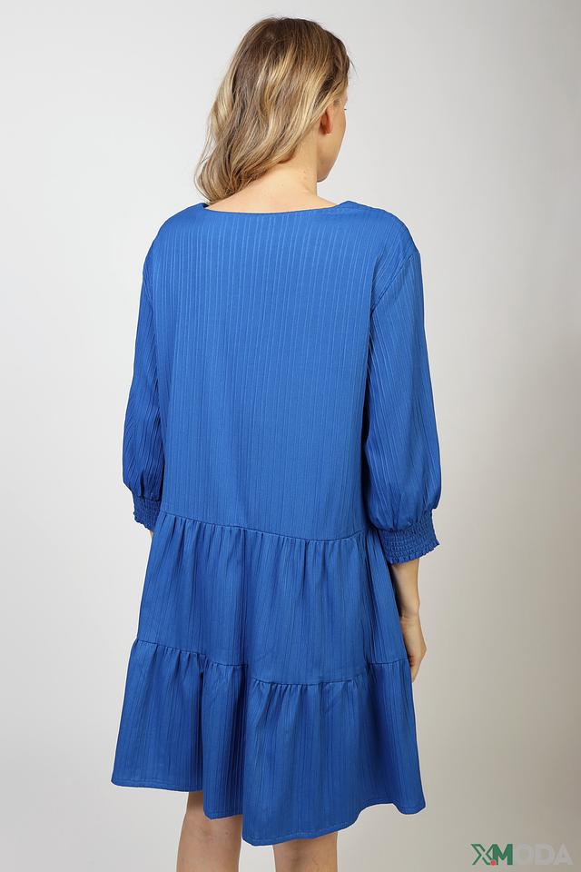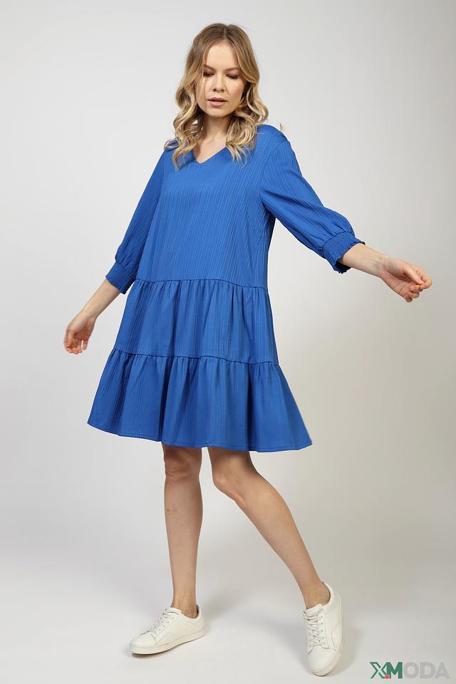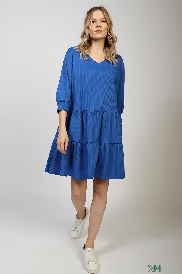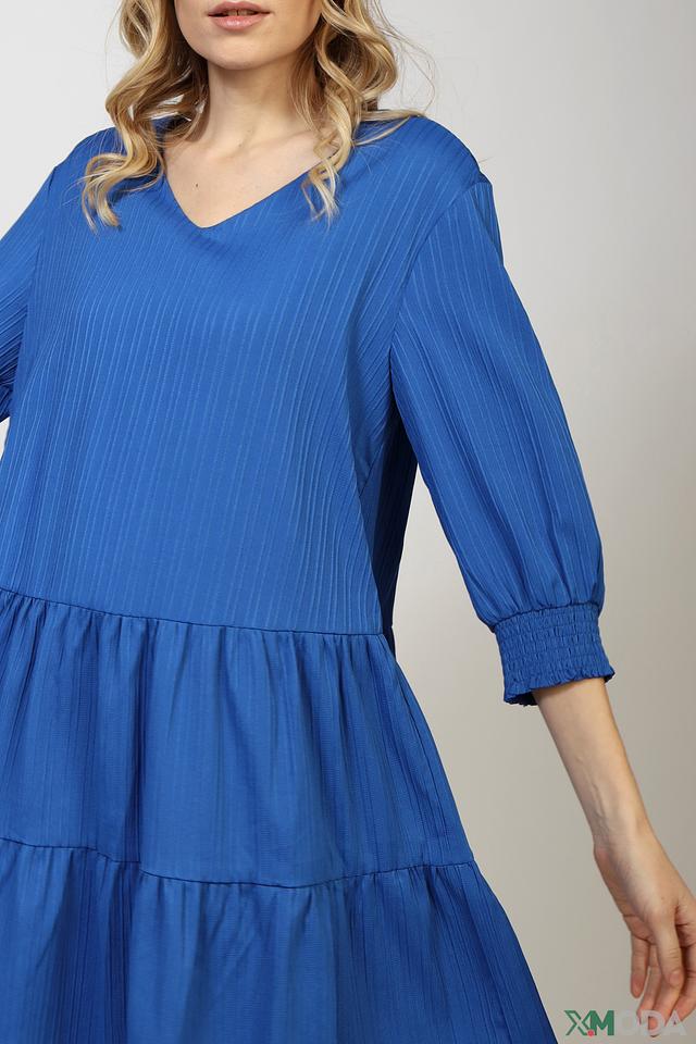 Платье имеет V-образный вырез и короткие рукава с манжетами, собранными резинкой. Силуэт платья – свободный, А-образный, с акцентом на талии благодаря сборкам. Нижняя часть платья оформлена в виде многослойной оборки, что добавляет образу воздушности и динамики.