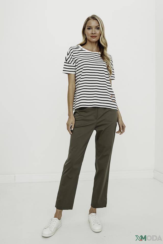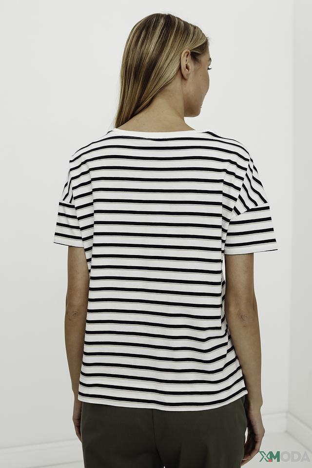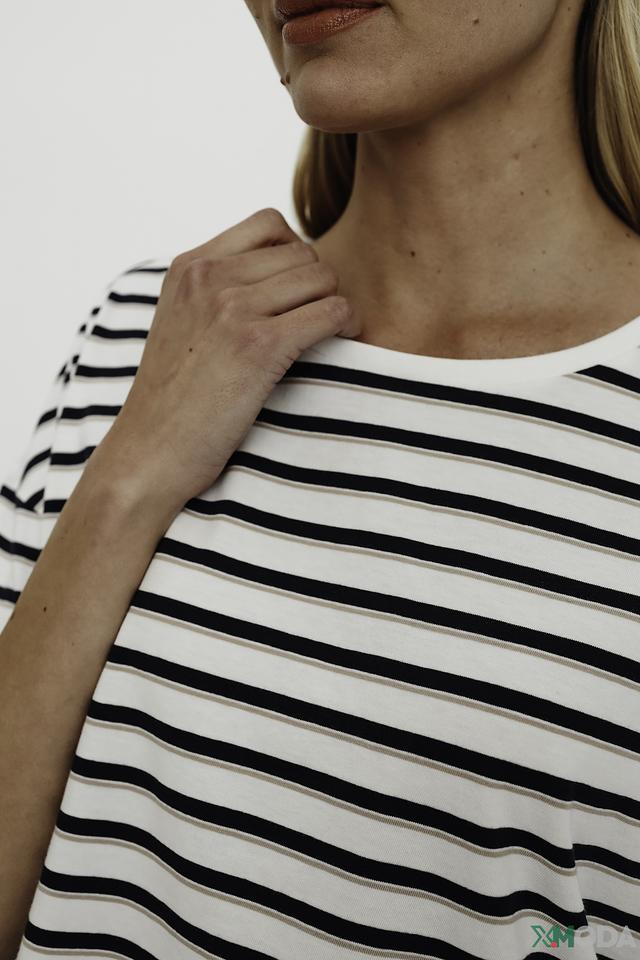 Эта стильная футболка от Comma станет отличным дополнением к вашему гардеробу. Выполнена в классическом дизайне с бело-черной полоской, что делает ее универсальной и легко сочетаемой с различными элементами одежды.