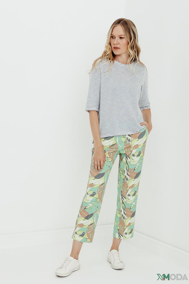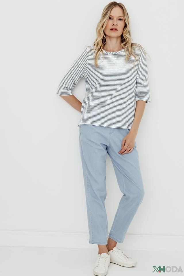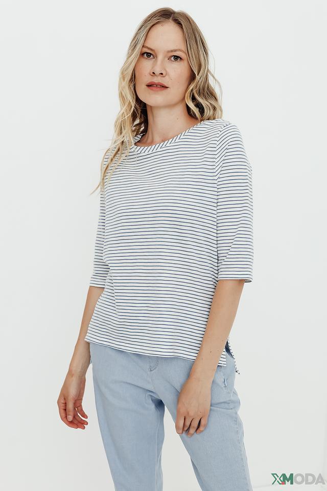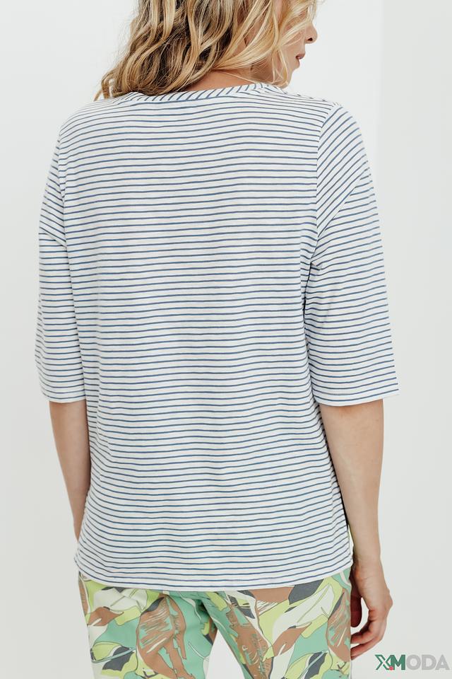 Женский джемпер Comma белого и голубого цвета в классическую полоску. Изготовлен из 100% хлопка, обеспечивающего комфорт и воздухопроницаемость. Укороченный рукав делает этот джемпер идеальным выбором для теплой погоды. Состав: хлопок 100%