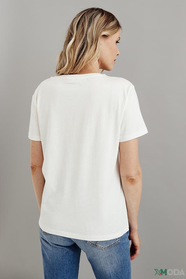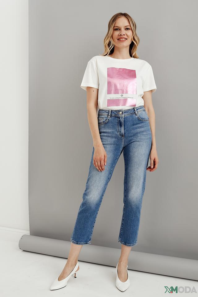 Круглый вырез горловины и короткие рукава обеспечивают классический и универсальный силуэт, подходящий для различных стилей и образов. Футболка идеально сочетается с джинсами, шортами или юбками, создавая непринужденный и модный вид.