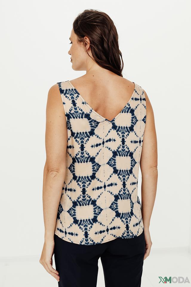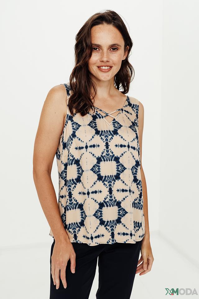 Топ Comma бежевого цвета с оригинальным принтом в стиле тай-дай станет отличным дополнением к летнему гардеробу. Модель без рукавов с V-образным вырезом и тонкими бретелями. Состав: вискоза 100%